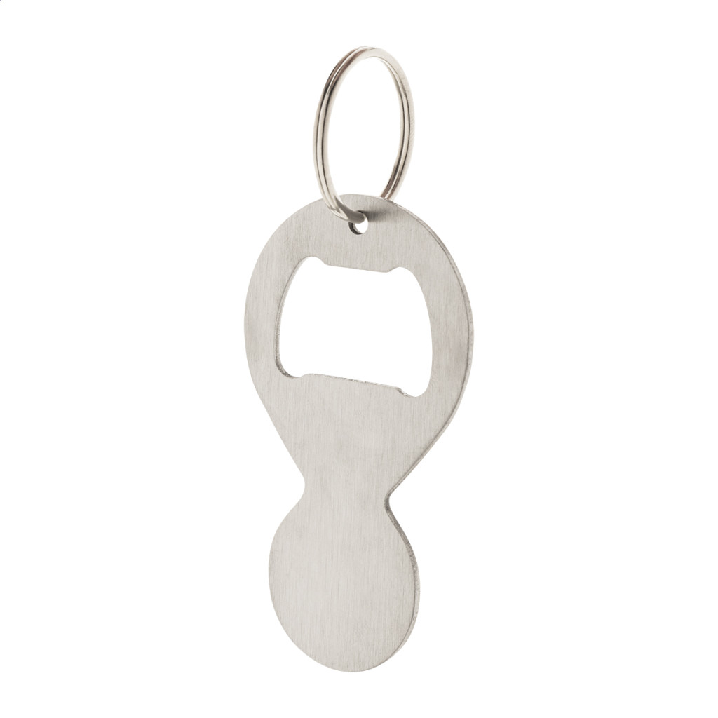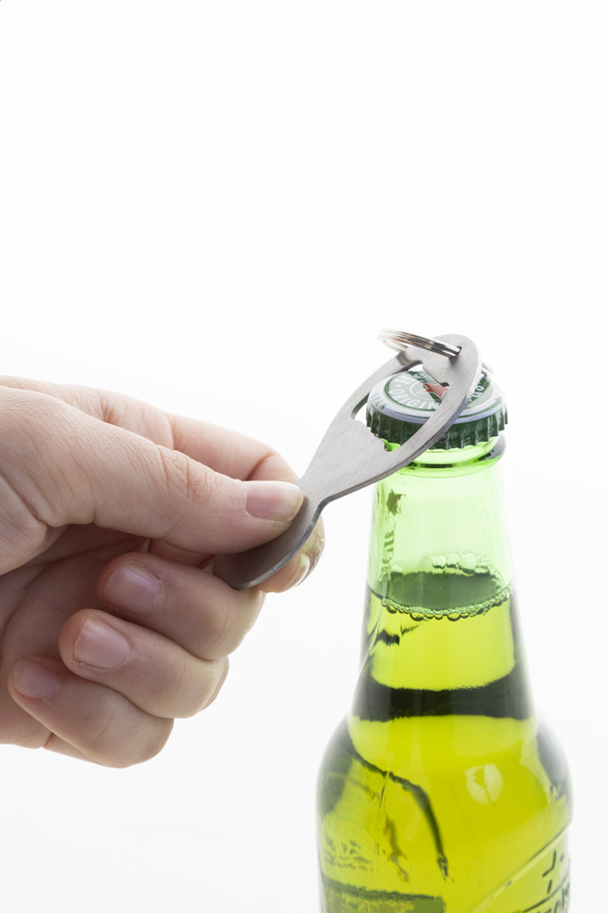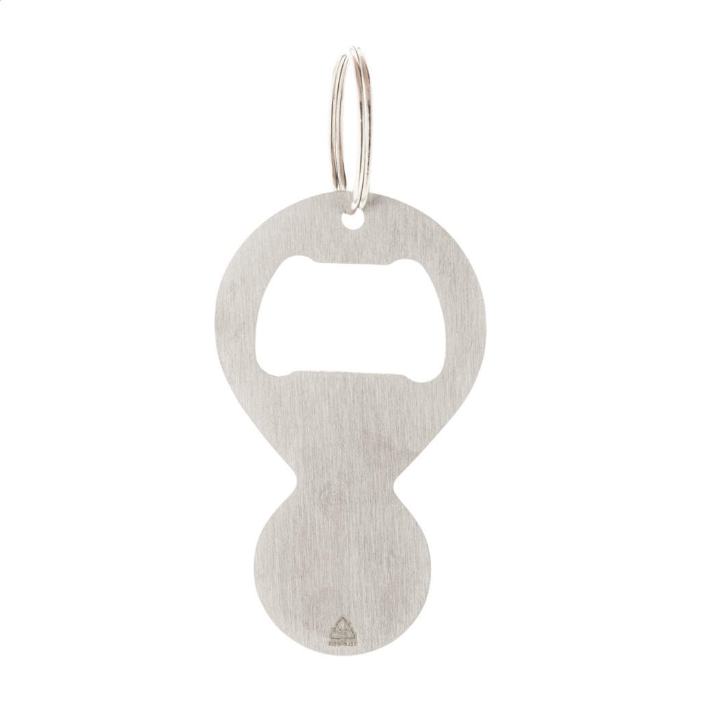 Újrahasznosított rozsdamentes acélból készült kulcstartó sörnyitóval és bevásárlókocsi érmével. Eleje