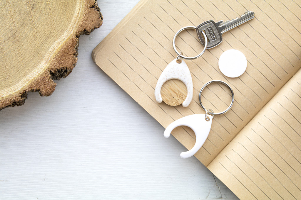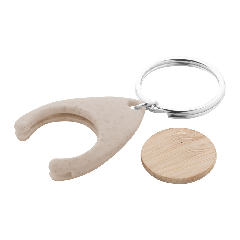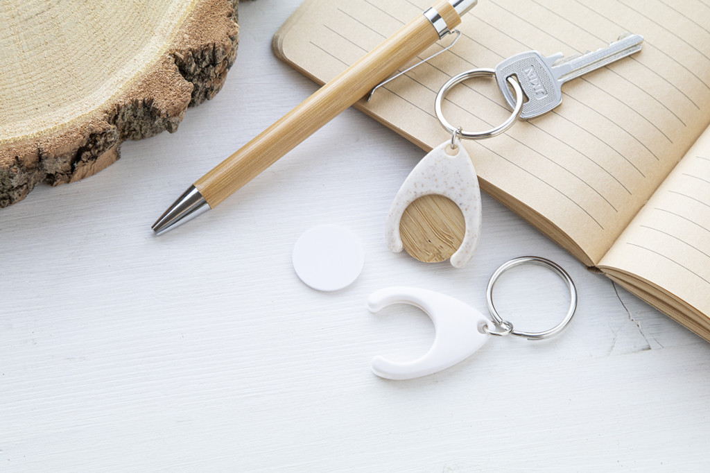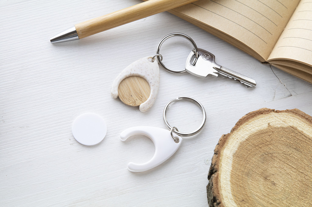 Bambusz bevásárló érme, környezetbarát búzaszalma műanyag kulcstartóval. Érme mérete: ø25×2 mm. Érme - eleje