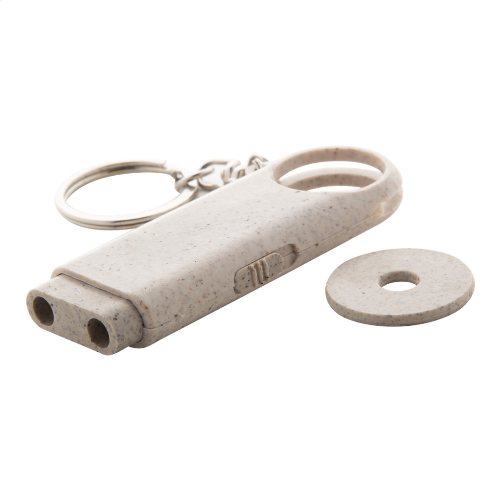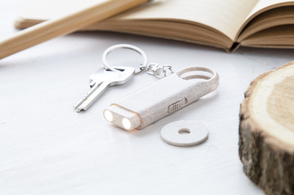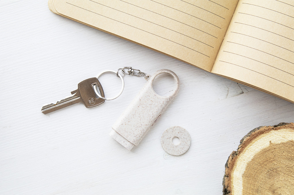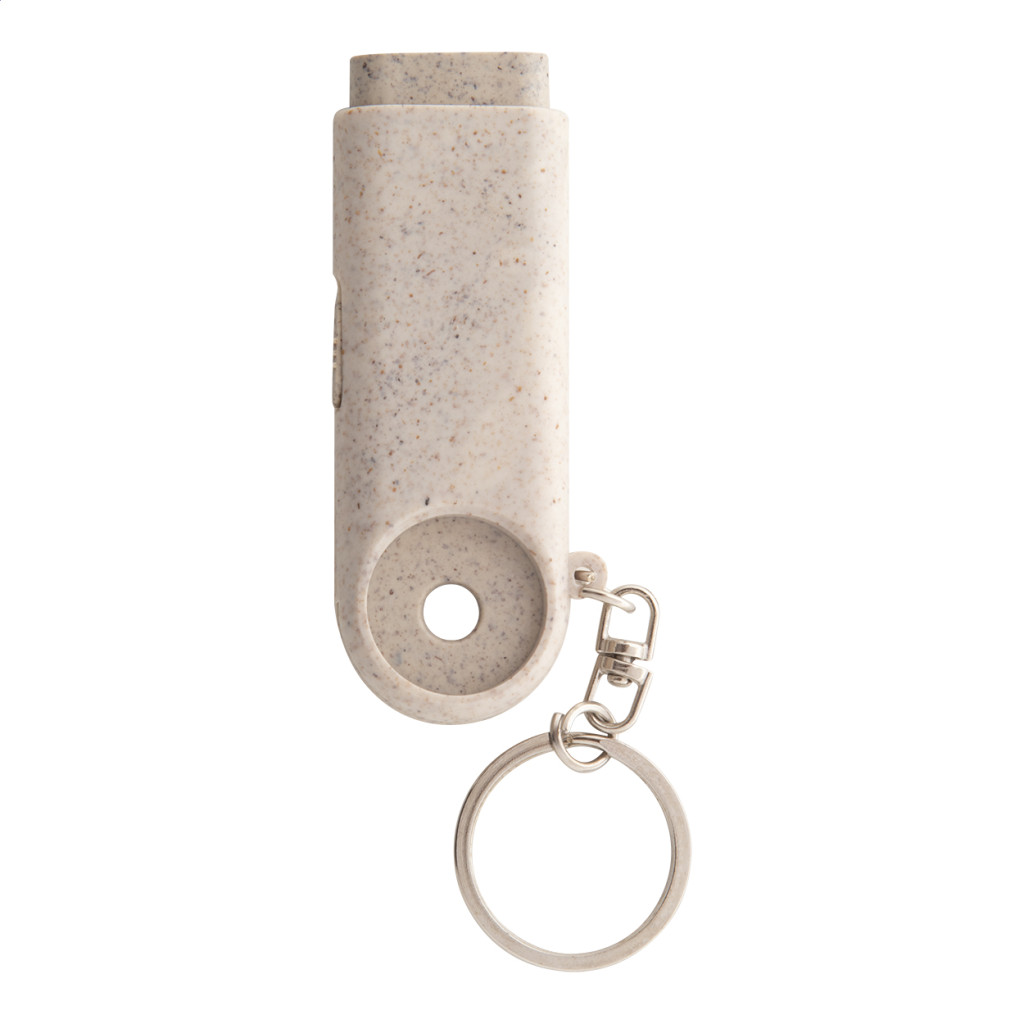 Környezetbarát búzaszalma műanyag kulcstartó bevásárló érmével és 2 LED-es lámpával. Gombelemmel szállítjuk. Eleje