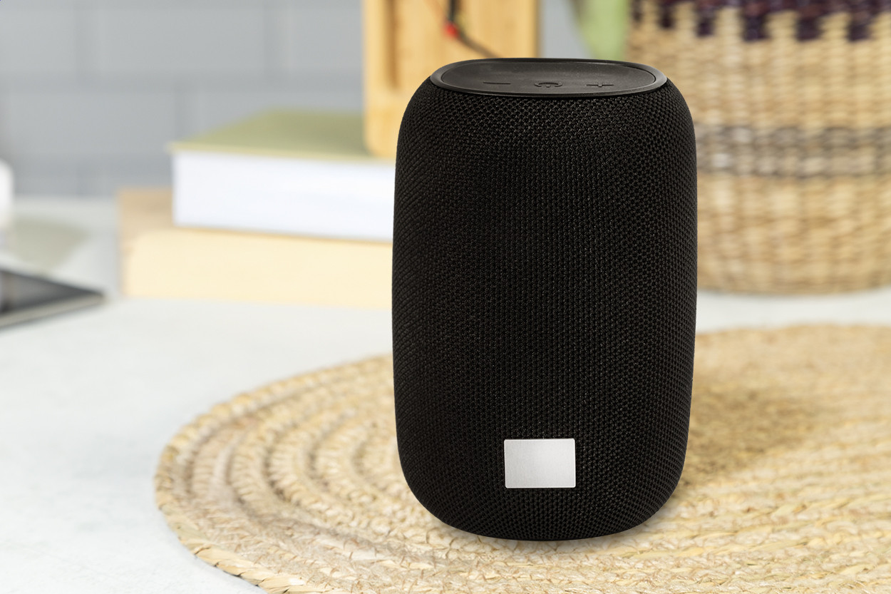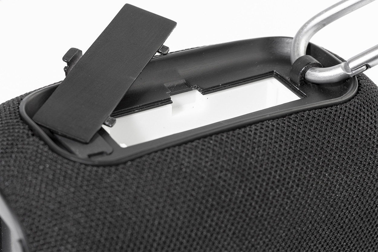 Újrahasznosított ABS vezeték nélküli hangszóró RPET poliészter hálóval, alumínium karabinerrel és fém logóval. Beépített újratölthető akkumulátorral (1800 mAh). USB töltőkábellel. Fém betét