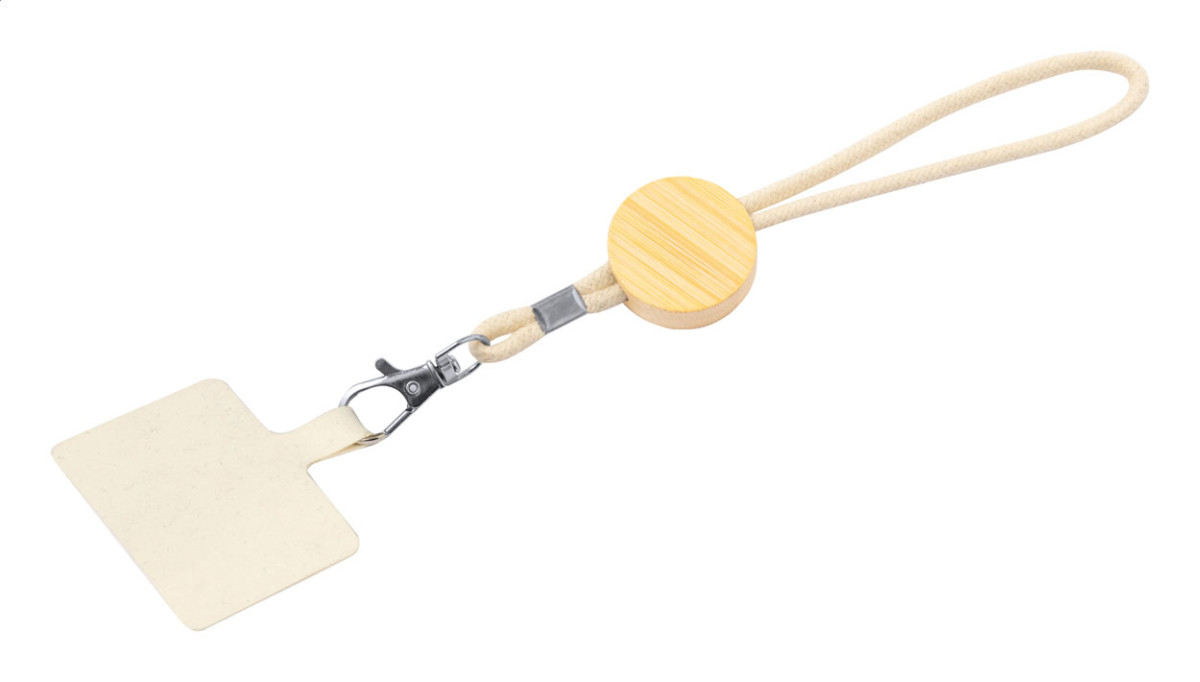 Pamut mobiltartós karkötő kerek bambusz címkével, telefonbetéttel és fém karabinerrel. Fa rész - eleje