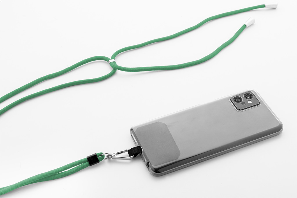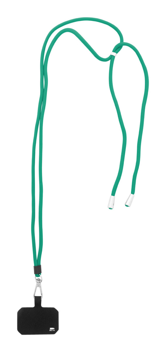 Állítható hosszúságú, RPET mobiltartó nyakpánt fém karabinerrel, biztonsági csattal és hozzáillő színű telefonbetéttel. Eleje