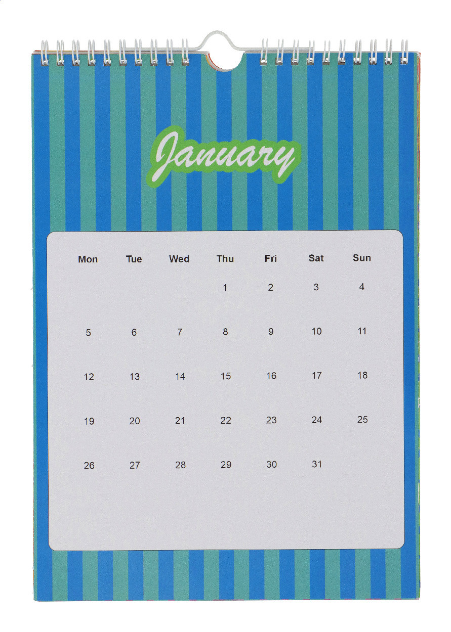 Egyedi gyártású, A4 méretű, spirál falinaptár full-colour grafikával és akasztóval. 6 kétoldalas havi lappal és egy borítóval. Az ár tartalmazza az összes oldal digitális nyomtatását. Minimális rendelési mennyiség: 100 db. Első borító