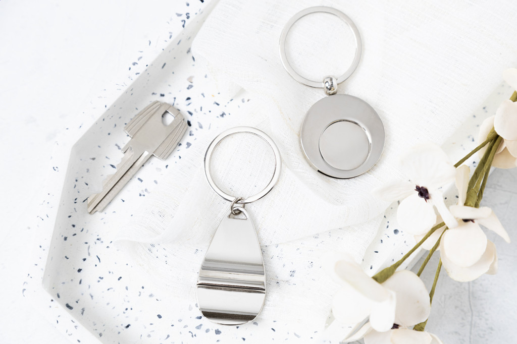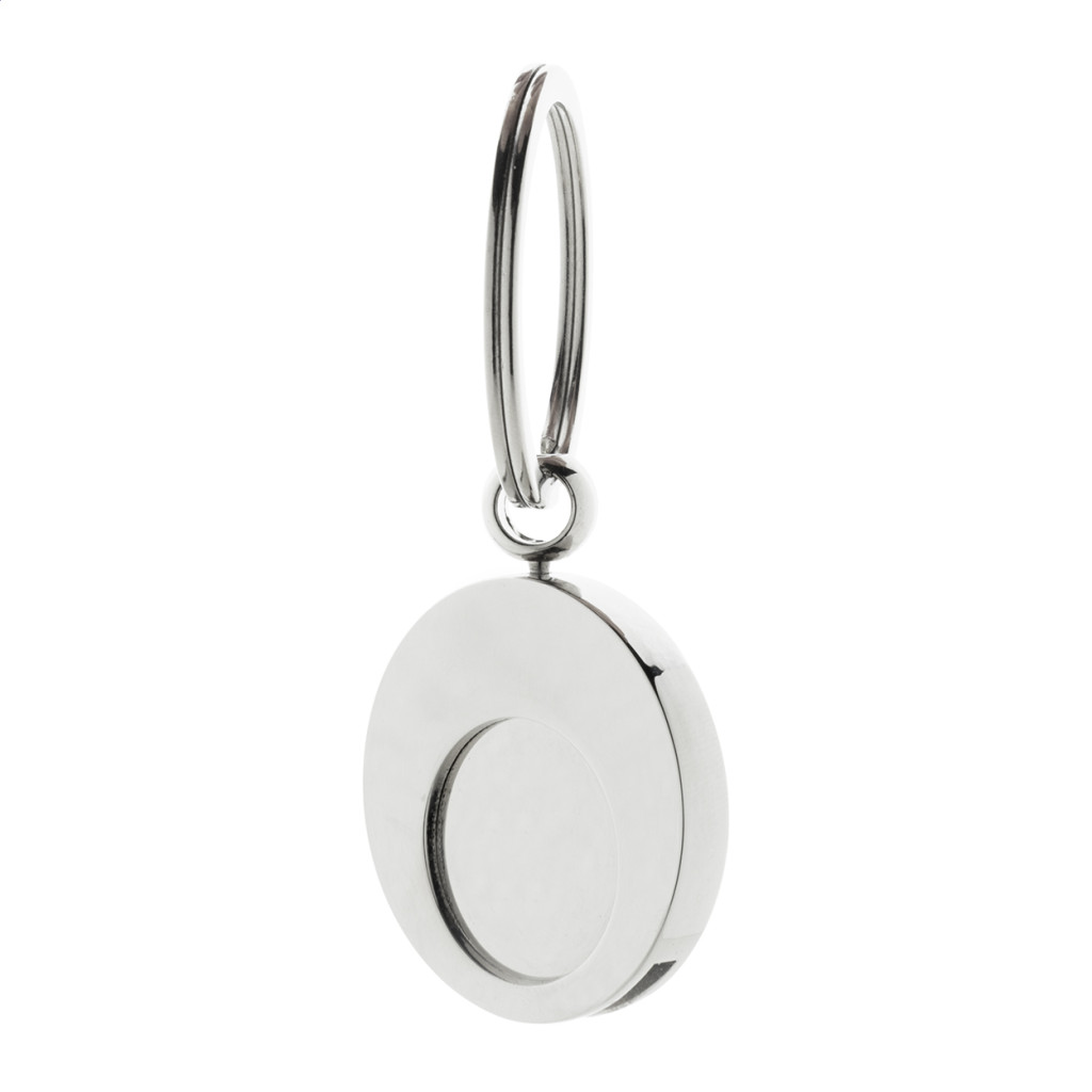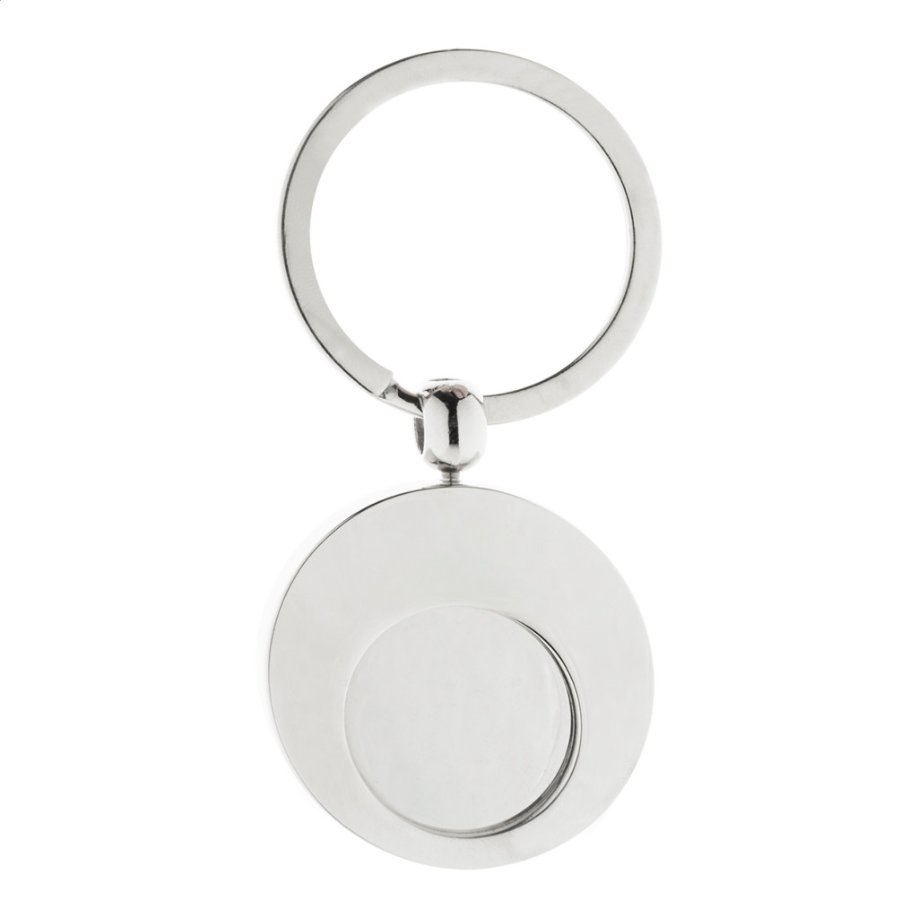 Kerek fém kulcstartó bevásárlókocsi érmével. Kraft papír dobozban. Eleje - teteje