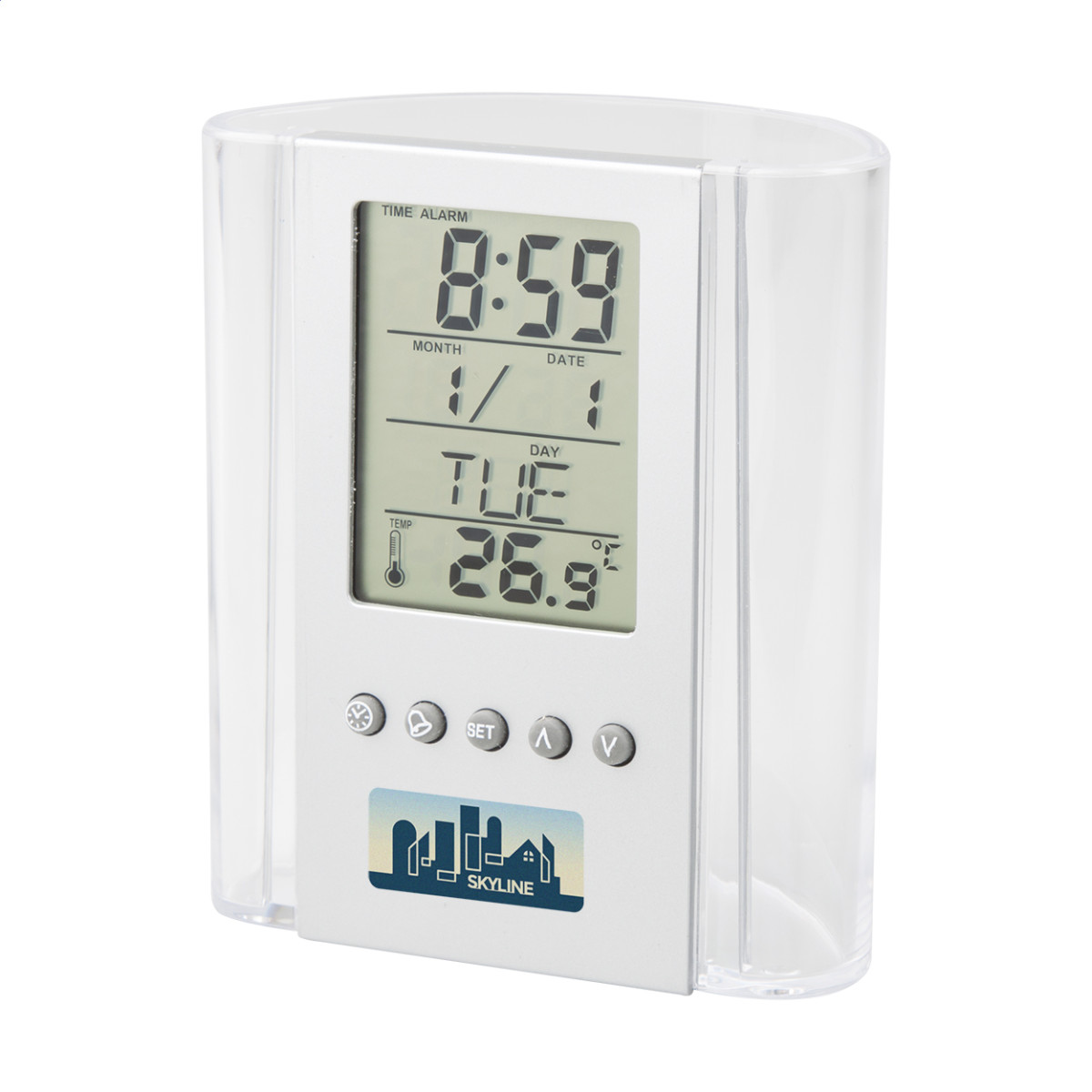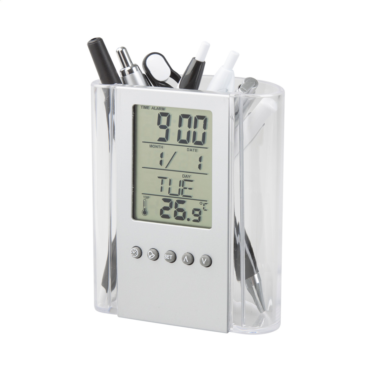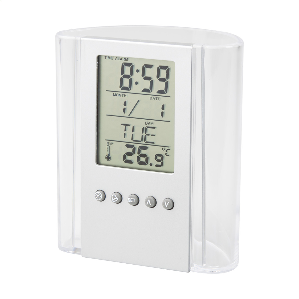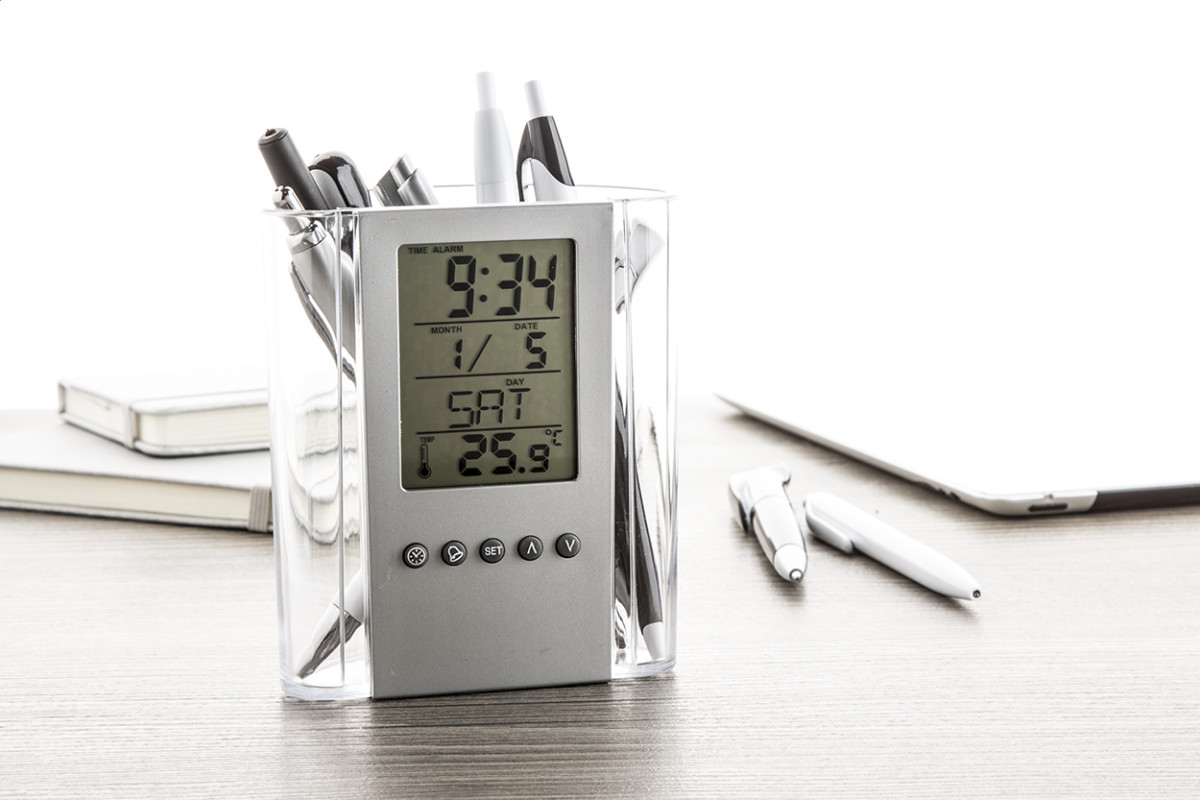 Átlátszó, műanyag tolltartó, digitális kijelzővel, (a kijelző rész levehető) mely mutatja az időt, hőmérsékletet, dátumot. Ébresztő funkciója is van. Elemmel szállítjuk. Gombok alatt