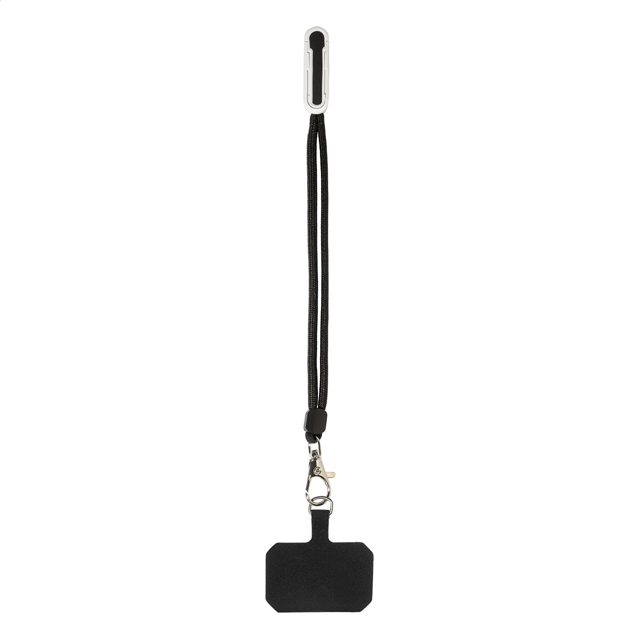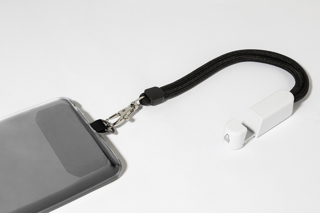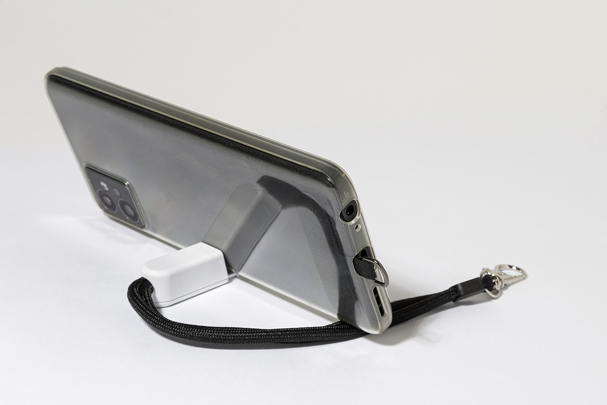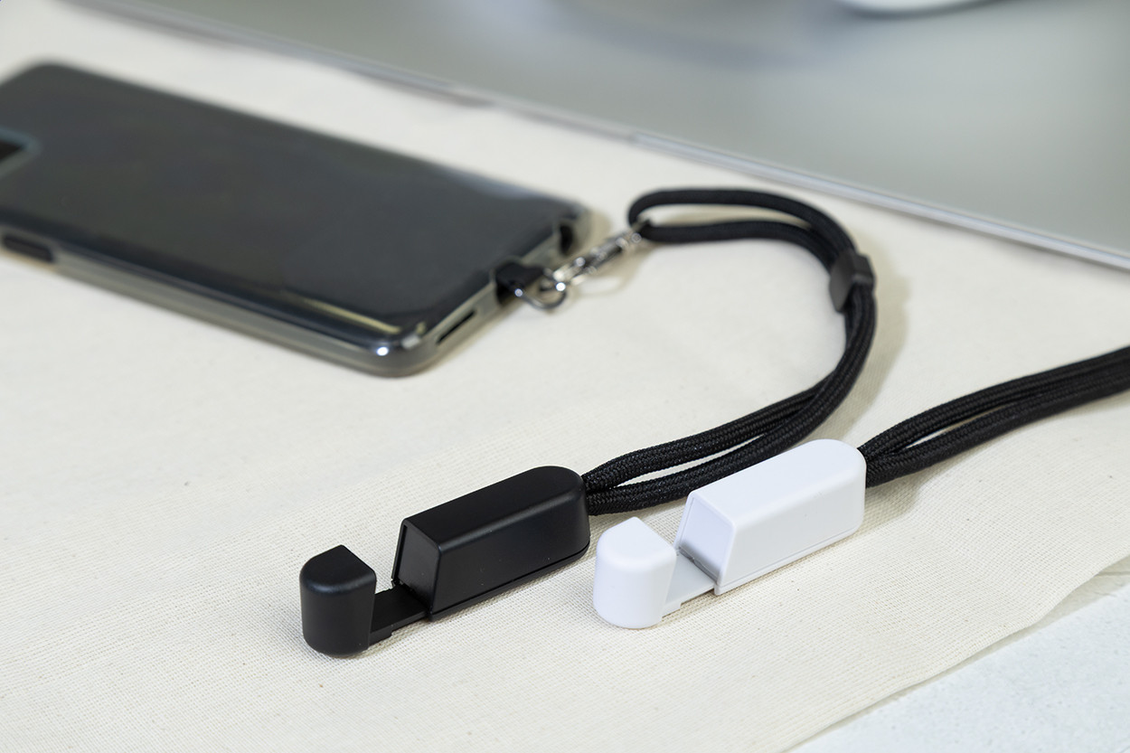 RPET mobiltartó csuklópánt telefonbetéttel és újrahasznosított ABS asztali mobiltartóval. Eleje