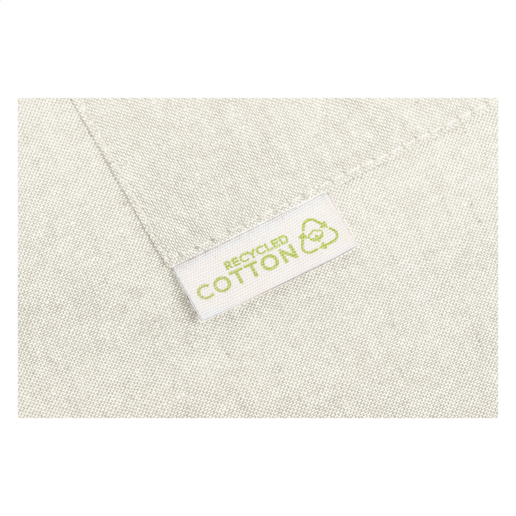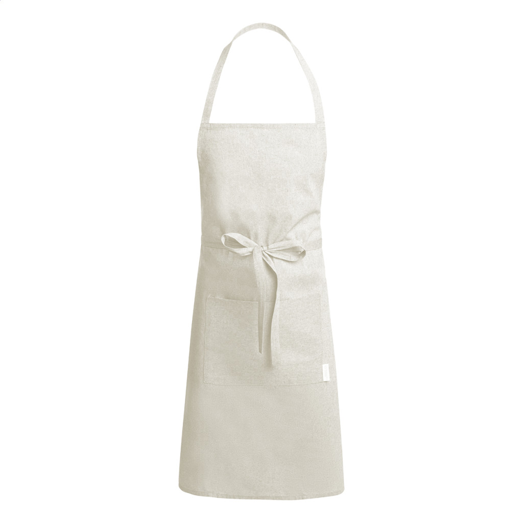 100% újrahasznosított pamutkötény elülső zsebbel, 140 g/m². Zseb fölött