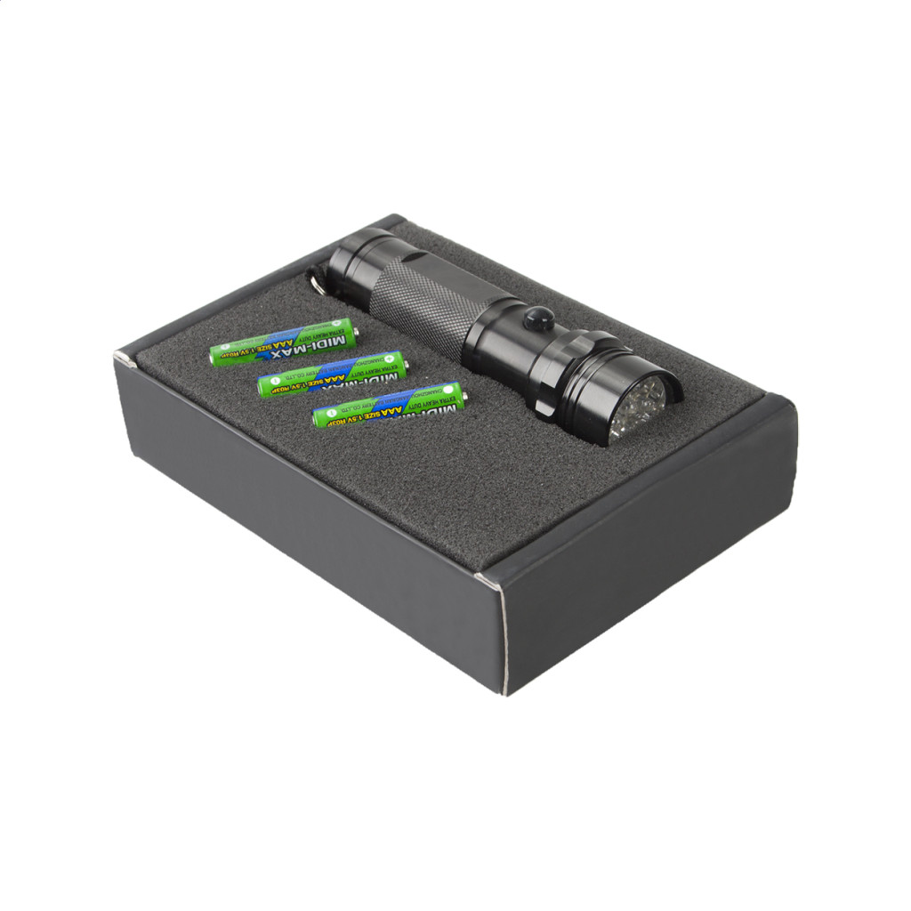 14 LED-es, alumínium elemlámpa, fekete díszdobozban. 3 db AAA elemmel szállítjuk. Jobb oldal