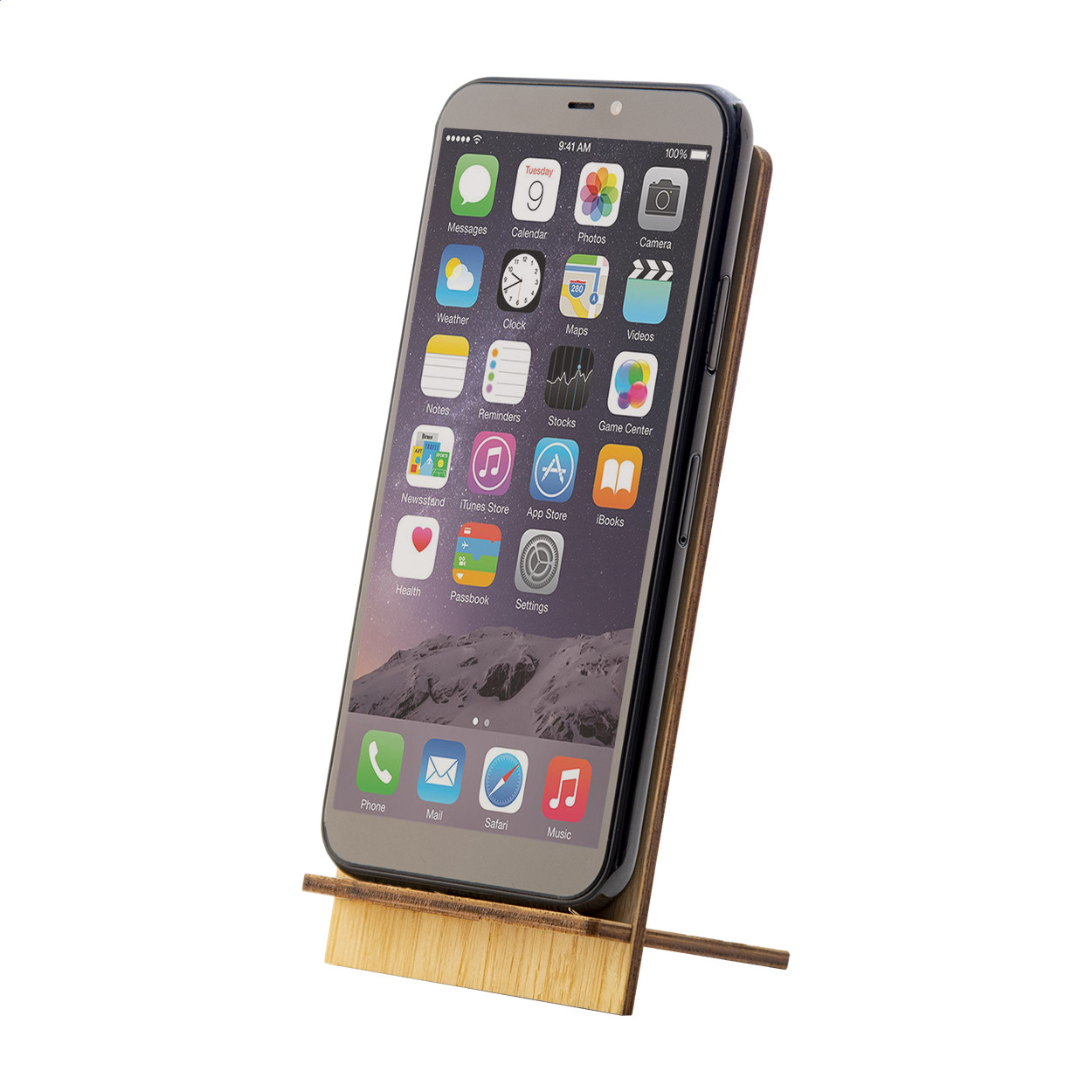 Asztali mobiltelefon-tartó bambusz furnérból. Lapra szerelve szállítjuk. Eleje
