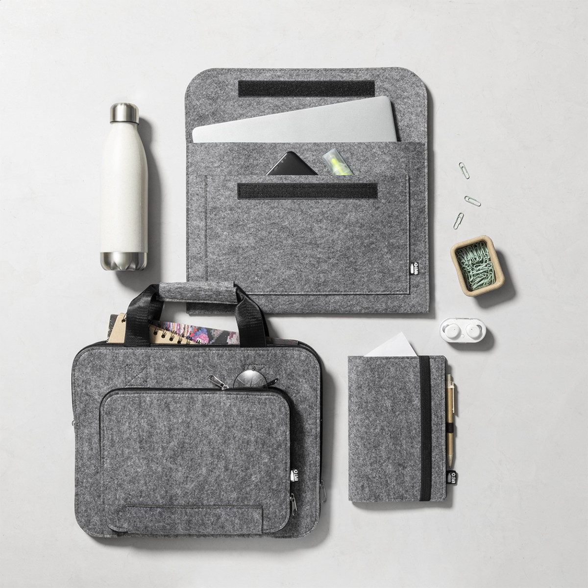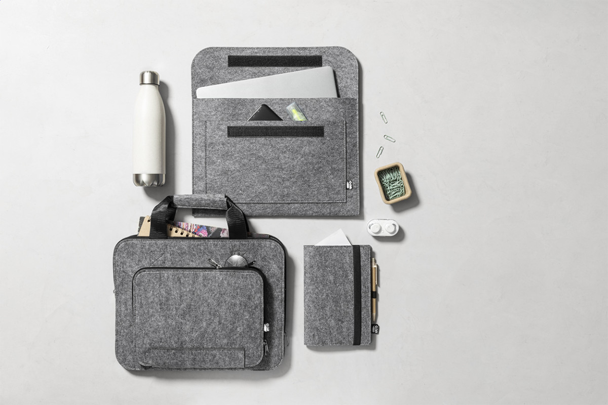 RPET filc laptoptáska elülső zsebbel és tépőzárral. Jellegzetes RPET címkével. Hajtóka