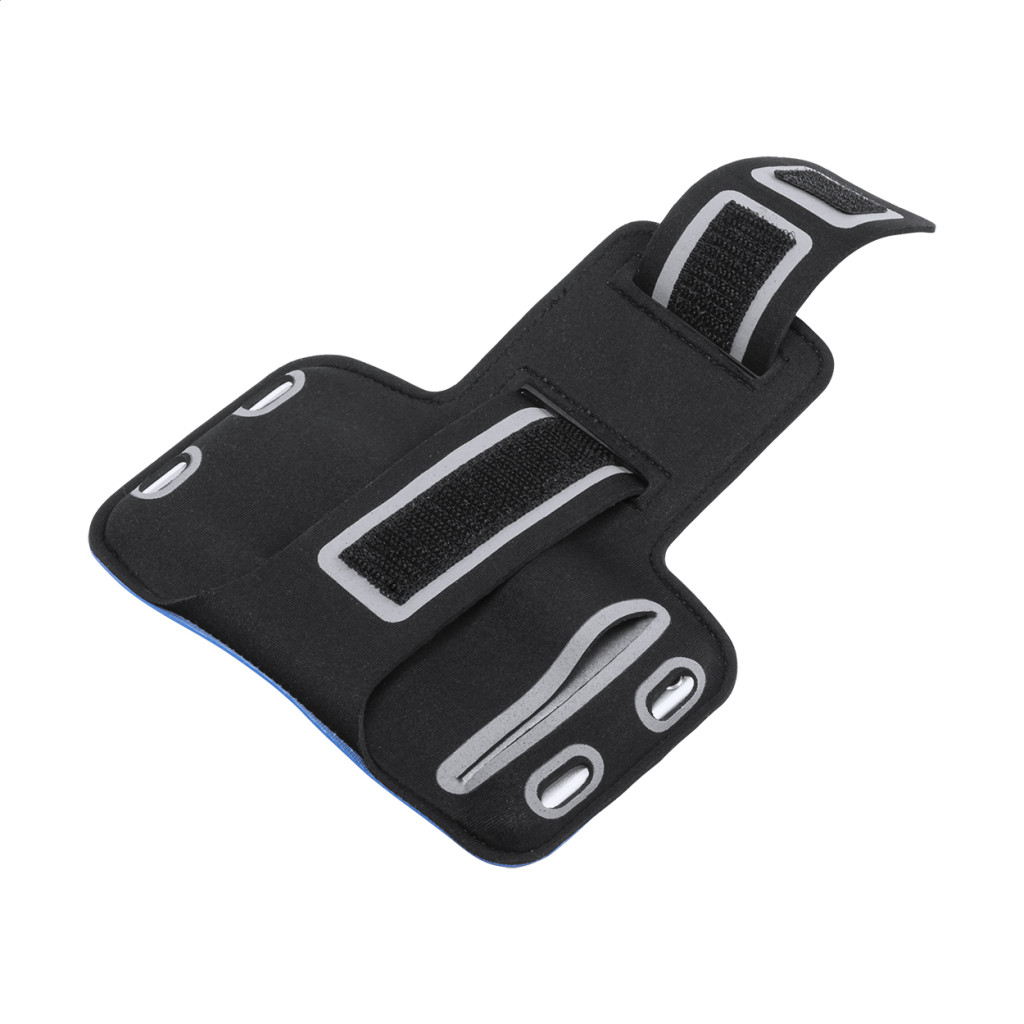Felkarra rögzíthető PU bőr mobiltelefon-tartó, érintőképernyős ablakkal és fényvisszaverő részekkel. Max. 6 colos kijelző méretű telefonokhoz. Eleje