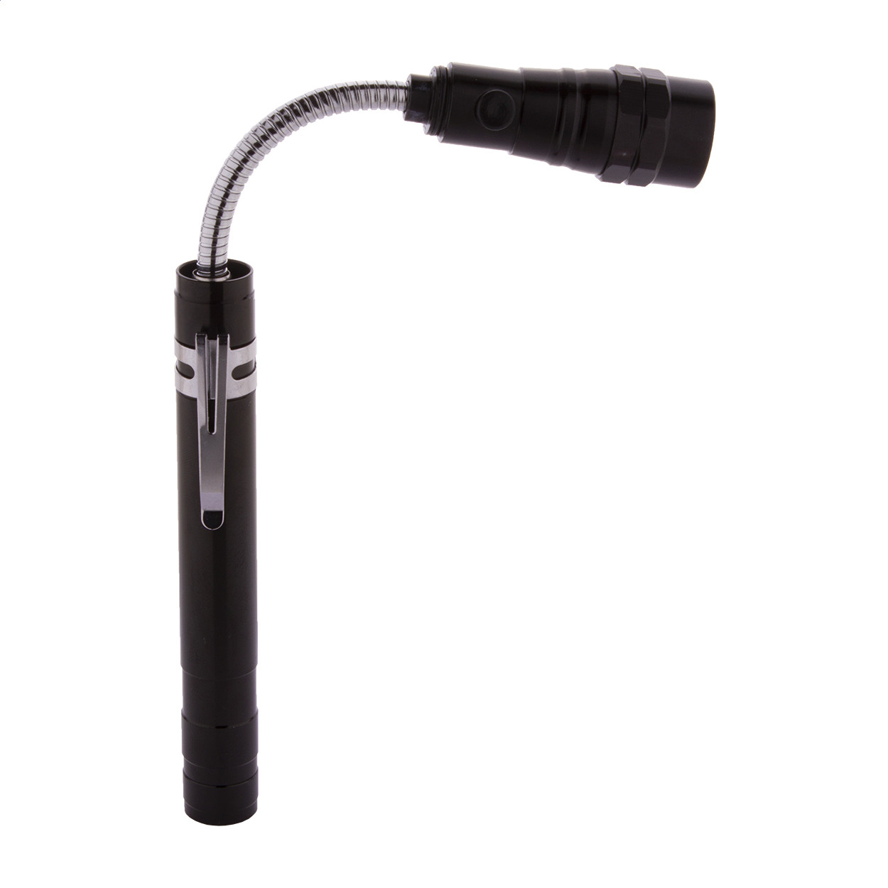 3 LED-es alumínium elemlámpa kihúzható és hajlítható fejjel, a tetején mágnessel és oldalsó fém klipsszel. A terméket gombelemekkel szállítjuk. Maximális hossza: 57 cm. Test - klipsz folytatása