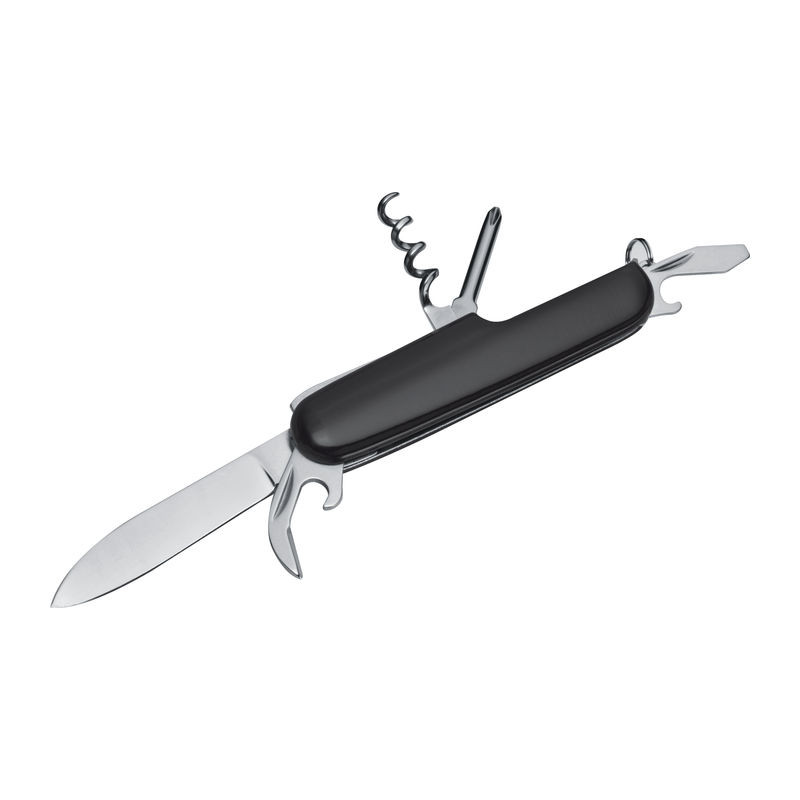 Rozsdamentes acélból készült 7 részes zsebkés amely tartalmaz üvegnyitót, bornyitót, csillag és laposfejű csavarhúzót, kulcstartót. Reklámajándék, üzleti ajándék. |