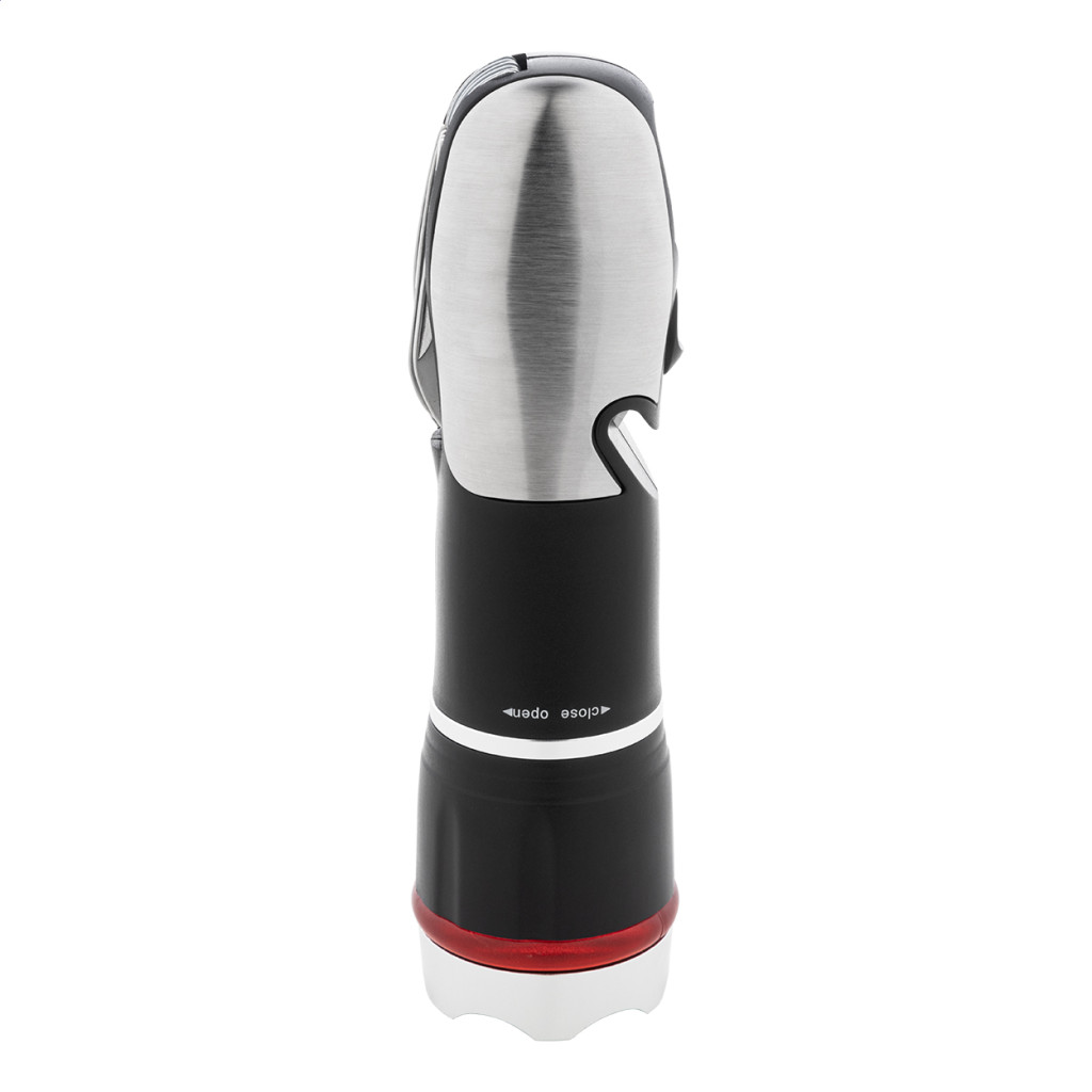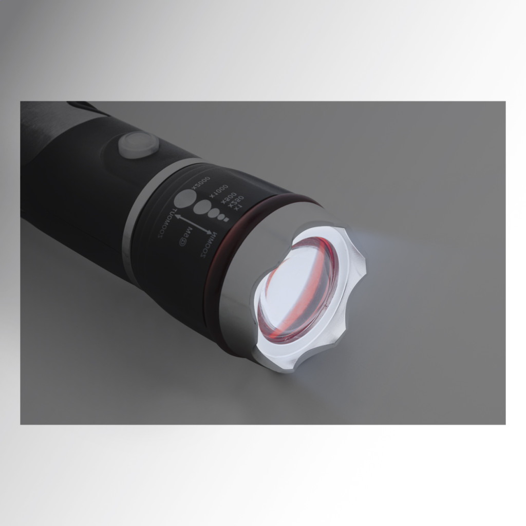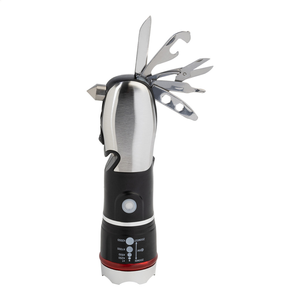 ABS-ből és rozsdamentes acélból készült multifunkcionális zseblámpa vészkalapáccsal, biztonsági övvágóval és multiszerszámmal, 9 funkcióval. Zoomolható LED világítással és 3 fénymóddal. 3 db AAA elemmel működik, elem nélkül szállítjuk. Eleje