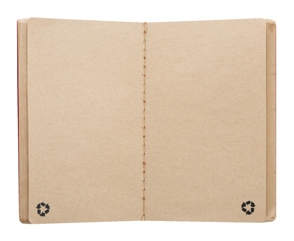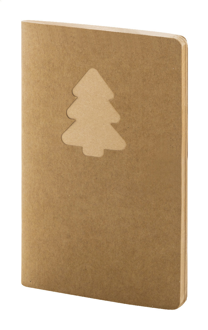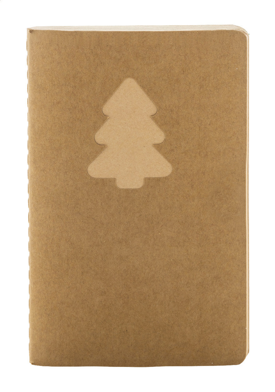Újrahasznosított kraft papírral borított jegyzetfüzet kivágott karácsonyfával és 60 sima, újrahasznosított kraft papírból készült lappal. A6 méret. Eleje