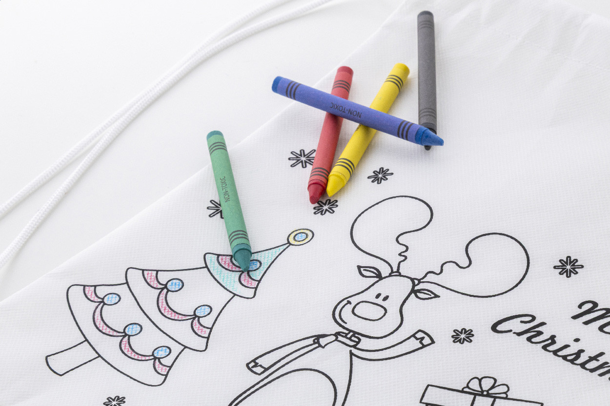 Karácsonyi színezhető, RPET non-woven anyagból készült hátizsák 5 db zsírkrétával. Eleje - teteje