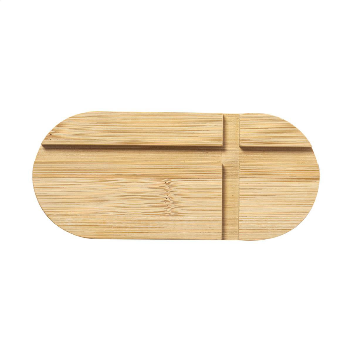 Bambuszból készült asztali mobiltelefon- és tablettartó. Jobb felső sarok