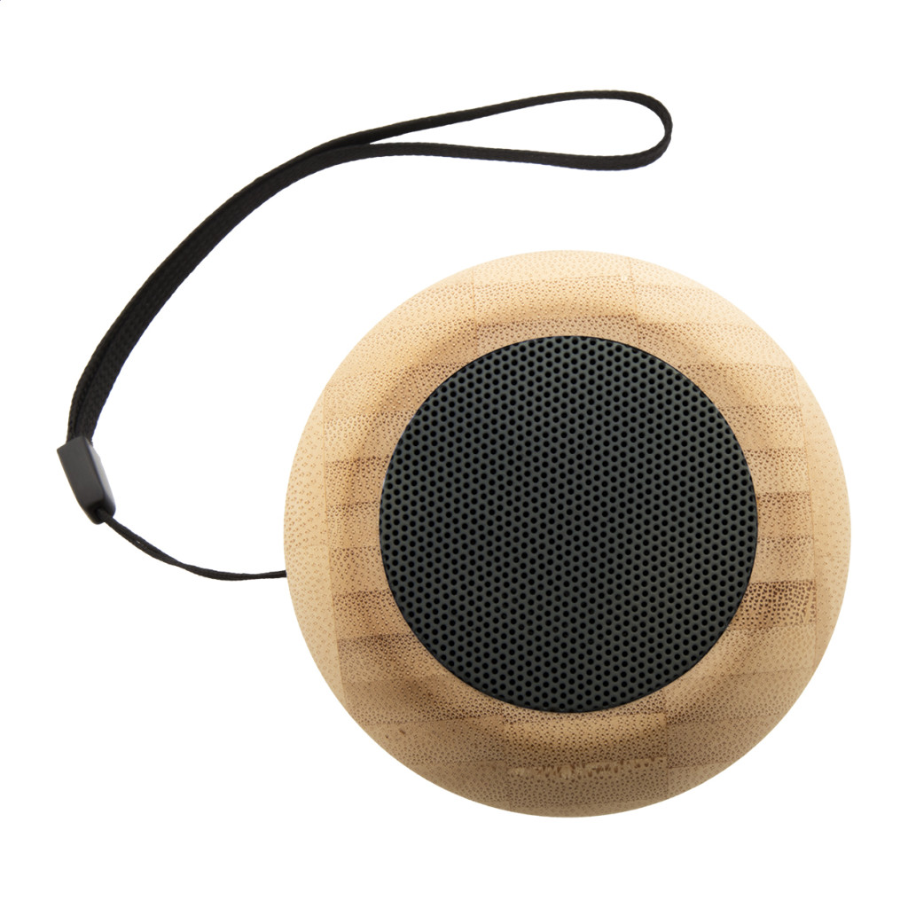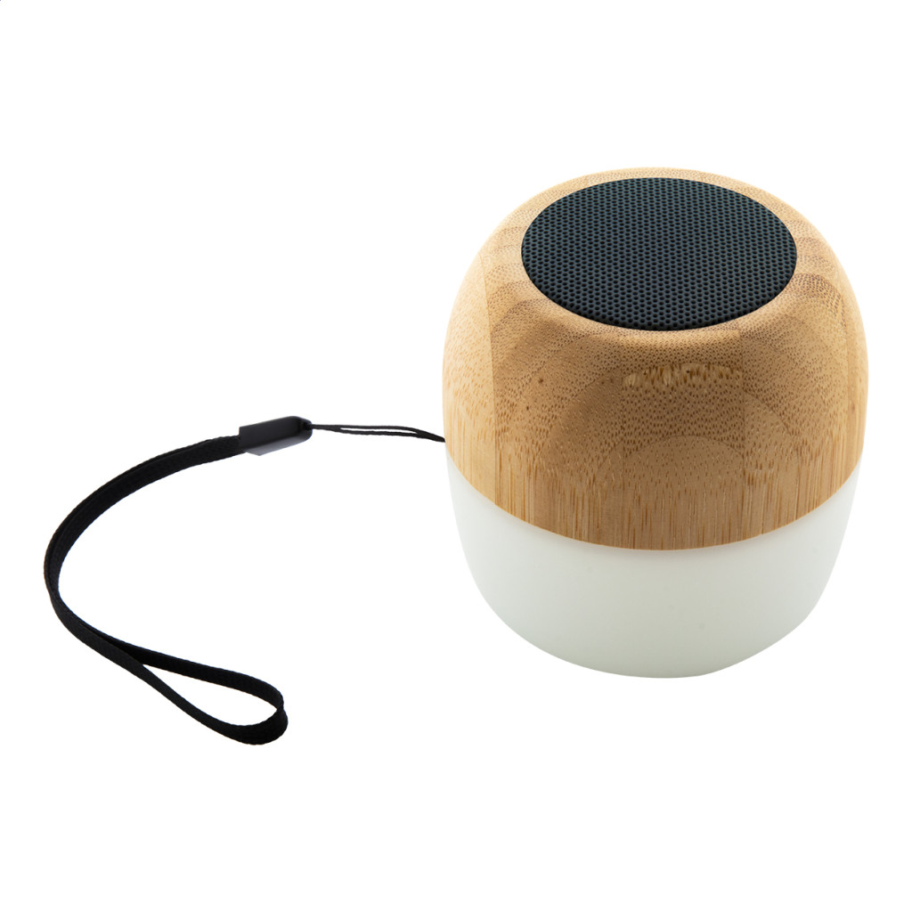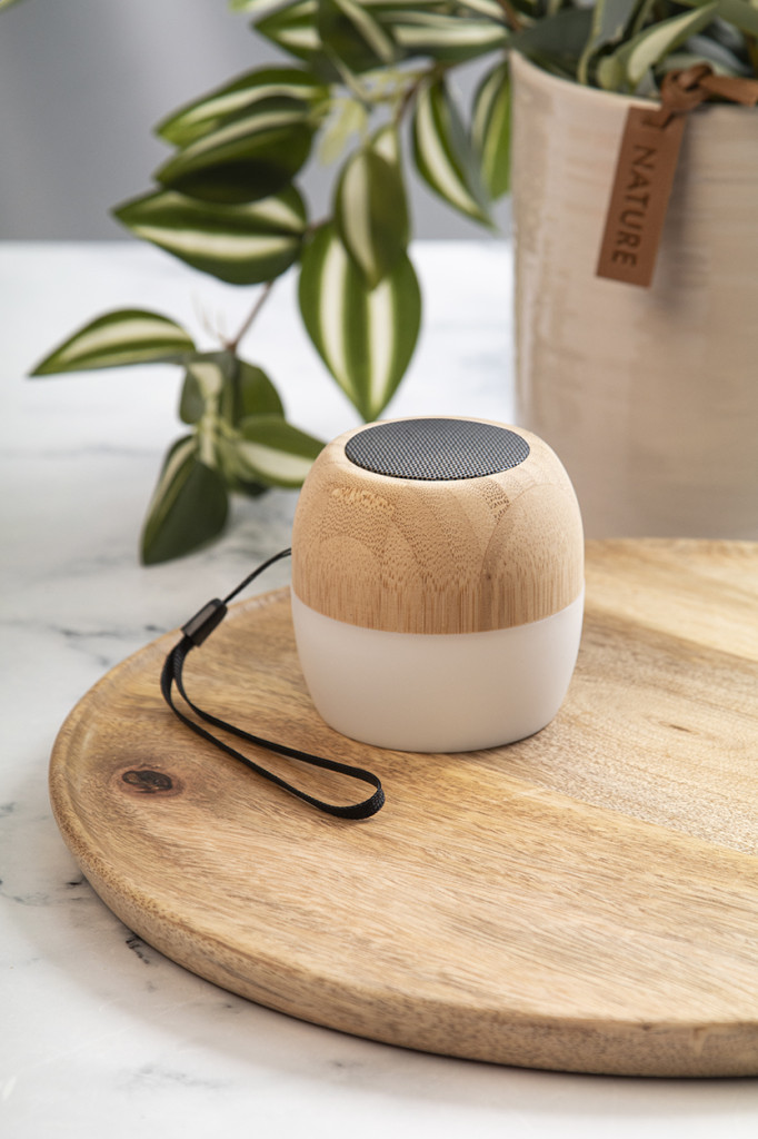 Vezeték nélküli hangszóró újrahasznosított ABS műanyag és bambusz borítással, többszínű LED lámpával az alján. Hordszíjjal és beépített újratölthető akkumulátorral. USB töltőkábellel szállítjuk. Eleje