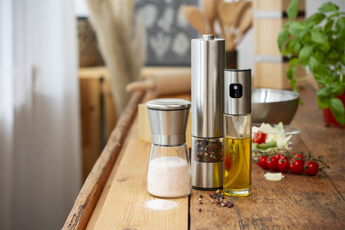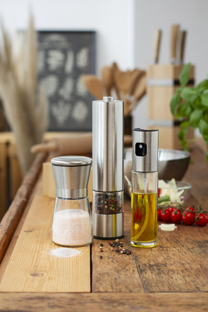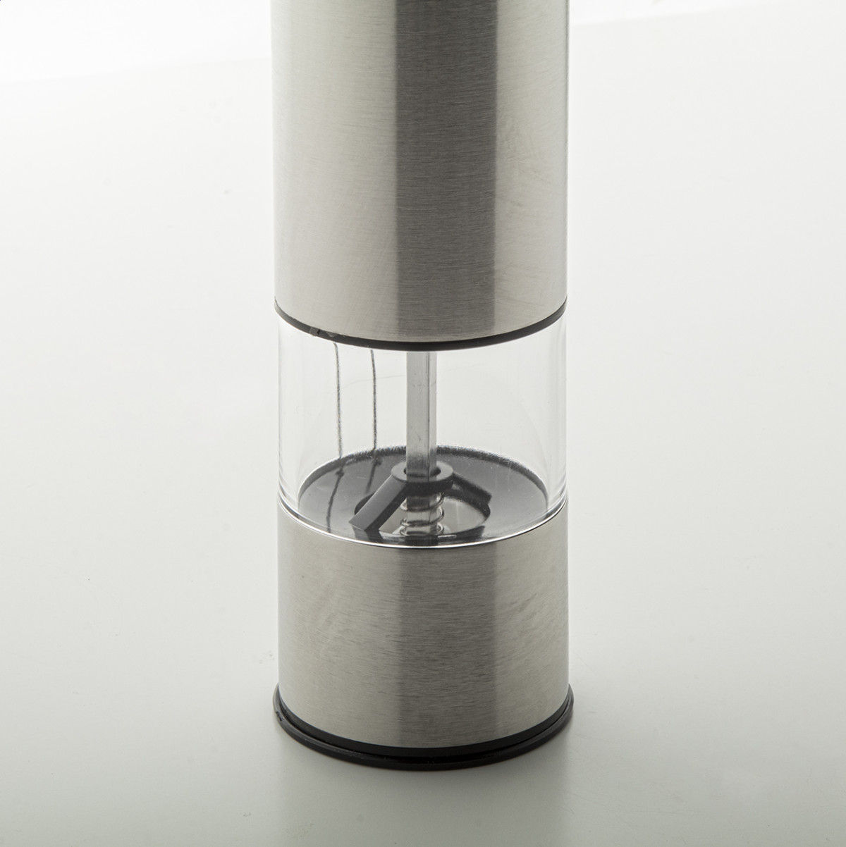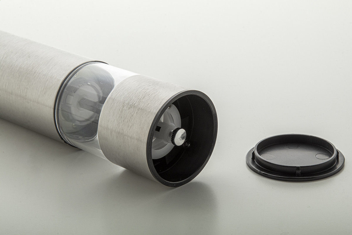 Rozsdamentes acélból készült elektromos só- és borsőrlő kerámia részlettel és LED lámpával. 4 db AA elemmel működik, elem nélkül szállítjuk. Eleje - teteje
