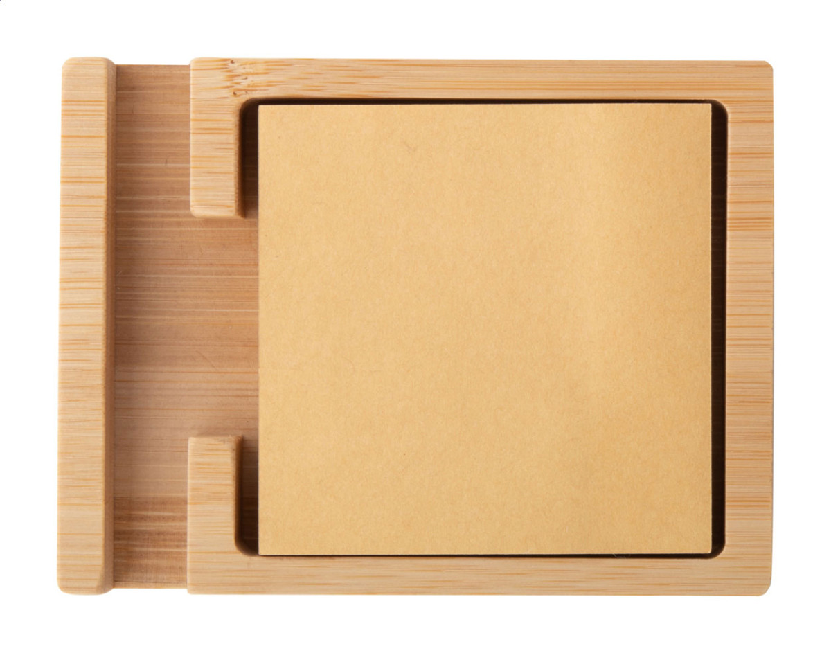 Bambusz mobiltelefon tartó, újrahasznosított kraft papírból készült 125 lapos jegyzettömbbel (75x75 mm). Eleje