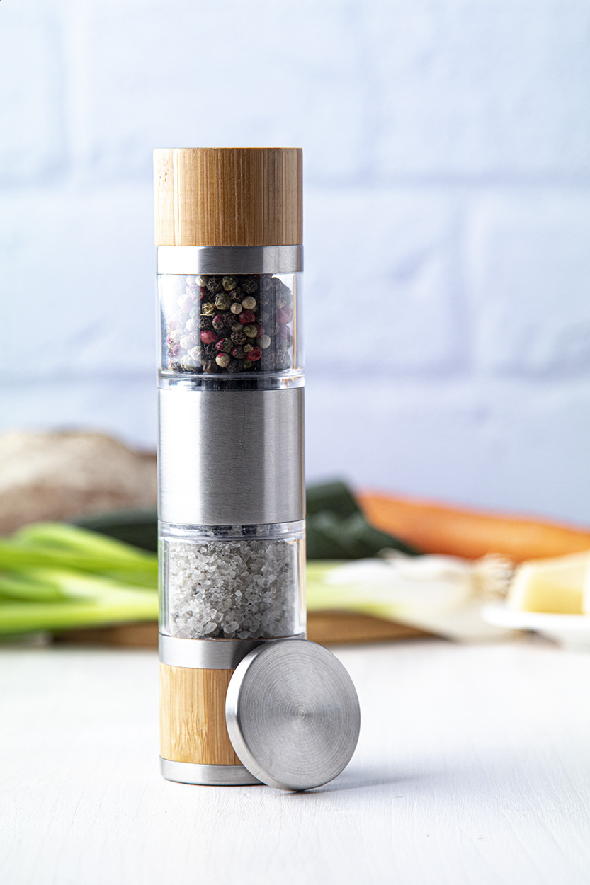 Rozsdamentes acélból készült kézi só- és borsőrlő, bambusz borítással és kerámia őrlőszerkezettel. Teteje