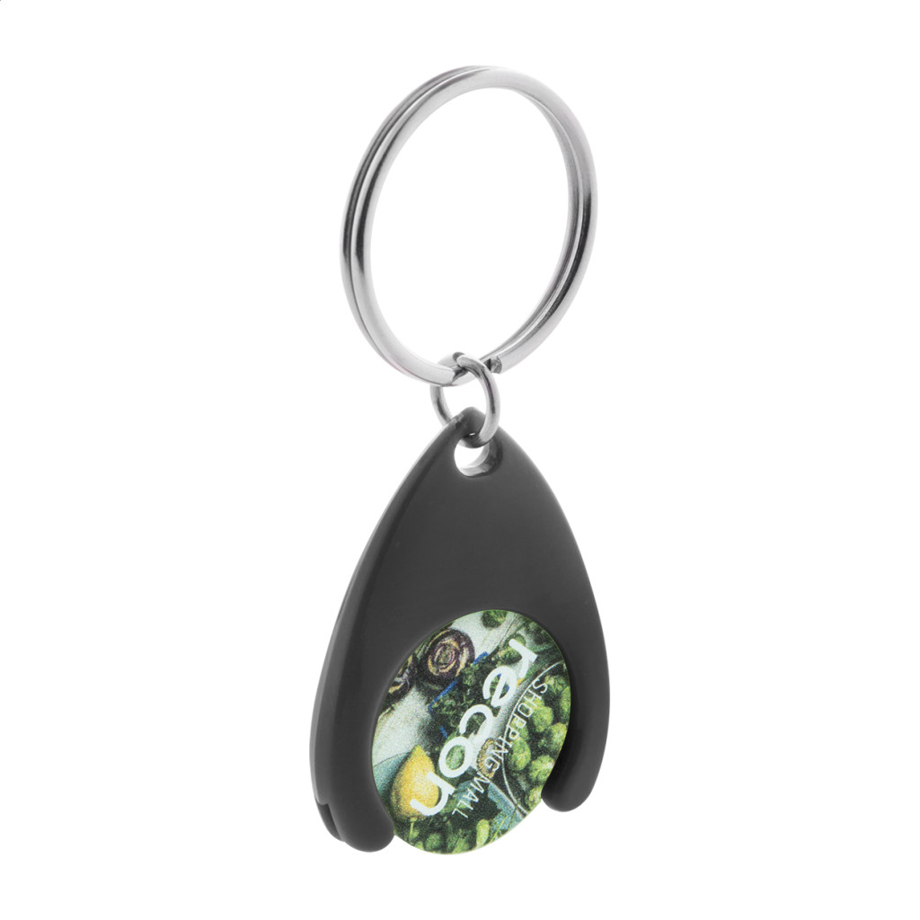 Műanyag bevásárlókocsi érme, fém kulcskarikával. Érme mérete: ø24×2 mm. Érme - eleje