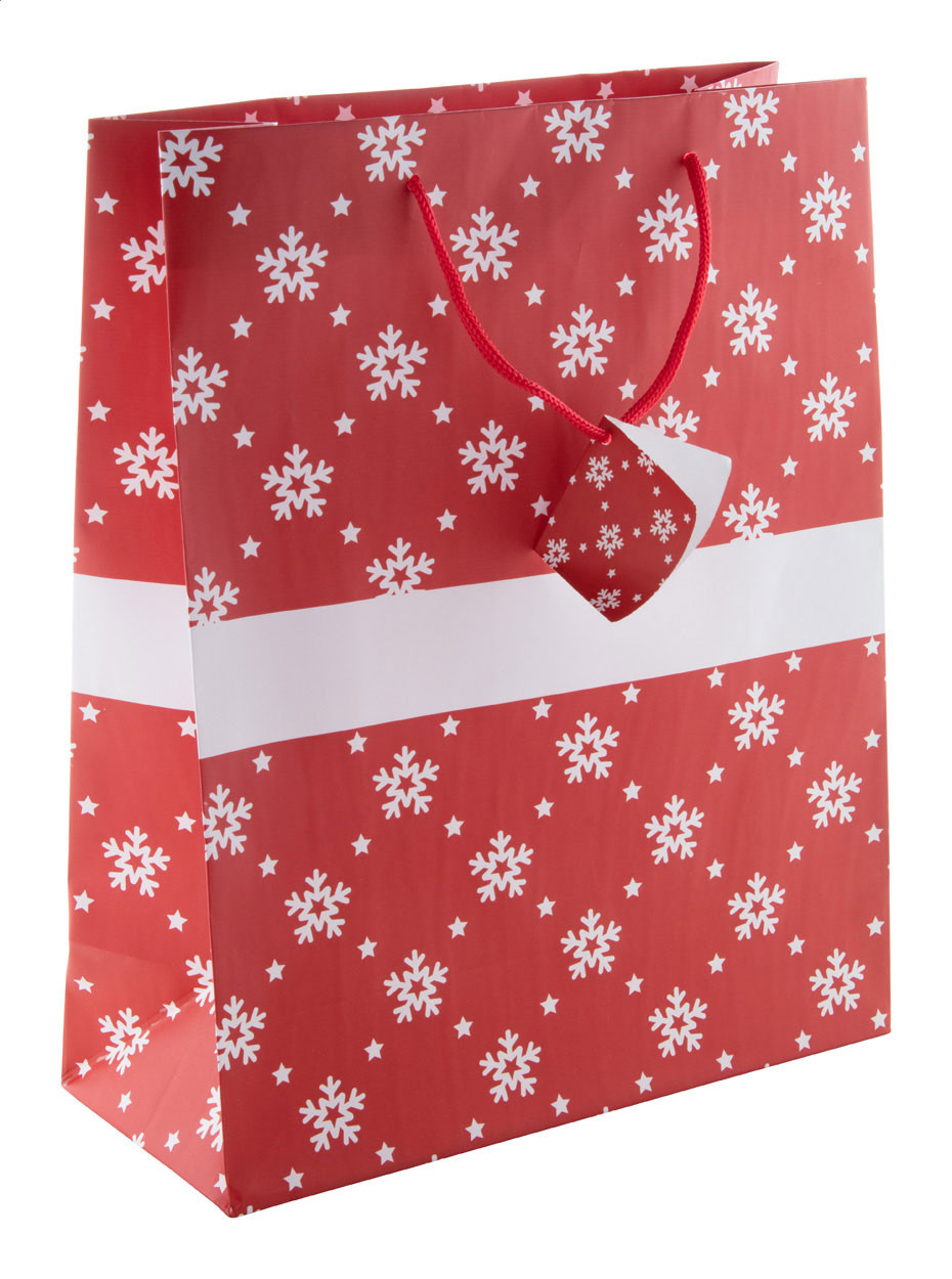 Matt, laminált papírtáska karácsonyi mintával, fehér nyomási felülettel és ajándékkísérővel. Eleje - közepe