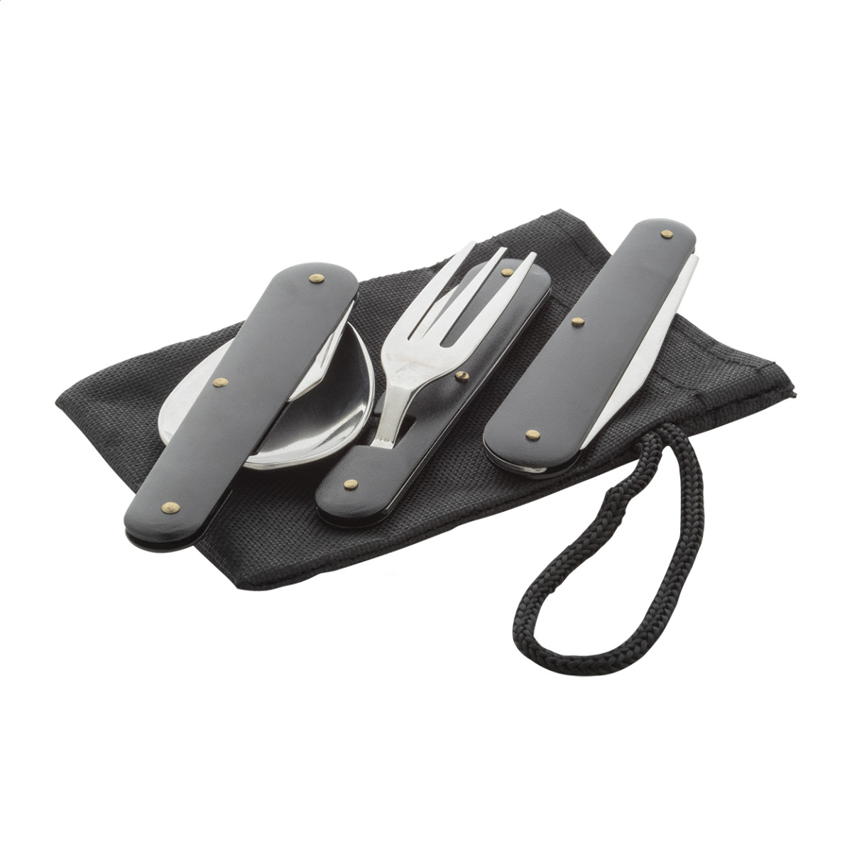 Összehajtható kemping evőeszköz szett rozsdamentes acélból, alumínium fogantyúval, 300D poliészter. Tartalma: villa, kés, kanál. Fekete hordtáskában. Tok eleje