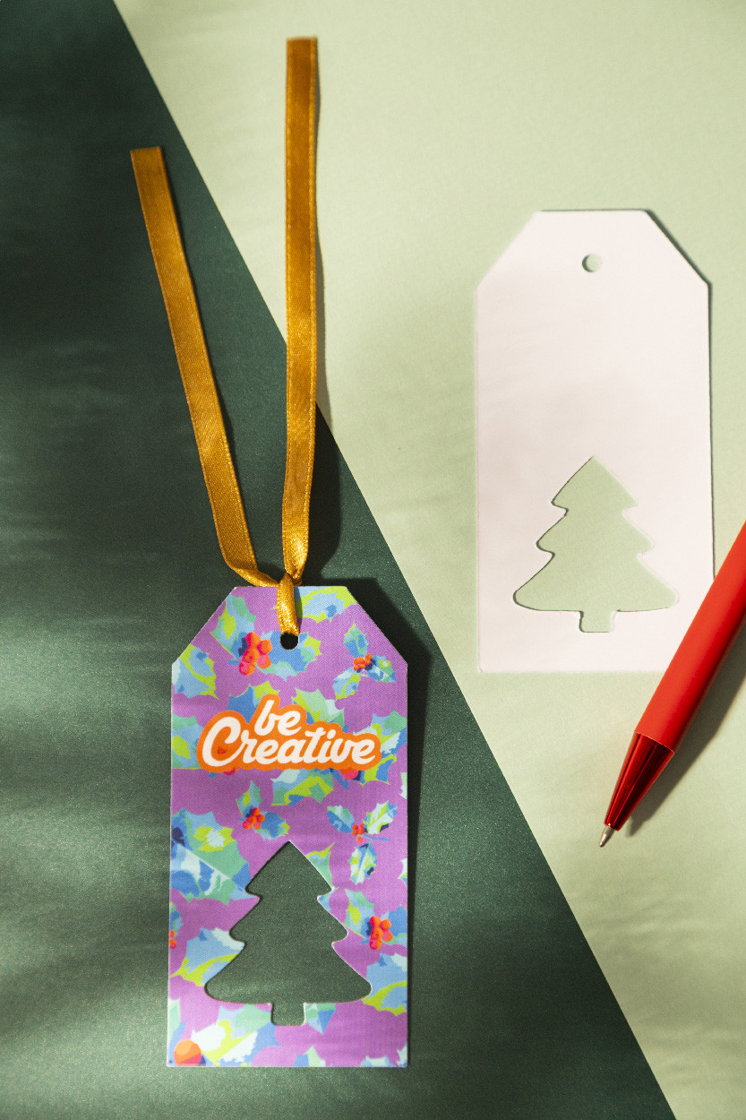 Egyedi gyártású, full-colour nyomtatott papír karácsonyi ajándékcímke kivágott karácsonyi motívummal és arany szalaggal. Az ár tartalmazza az egyik oldal digitális nyomtatását. Minimális rendelési mennyiség: 100 db. Eleje