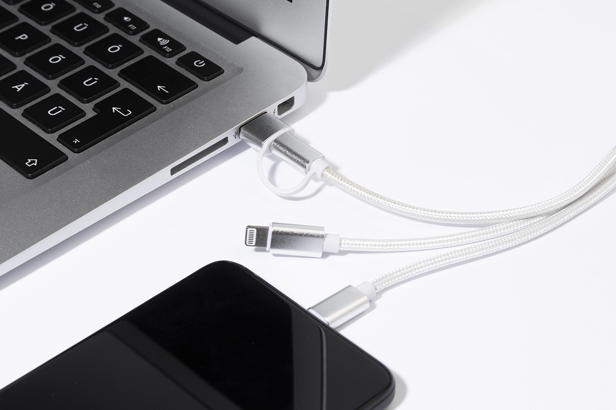 Újrahasznosított alumínium és RPET USB töltőkábel kulcstartóval. Micro USB, USB-C és Lightning csatlakozókkal. USB és USB-C bemenetekkel. Eleje