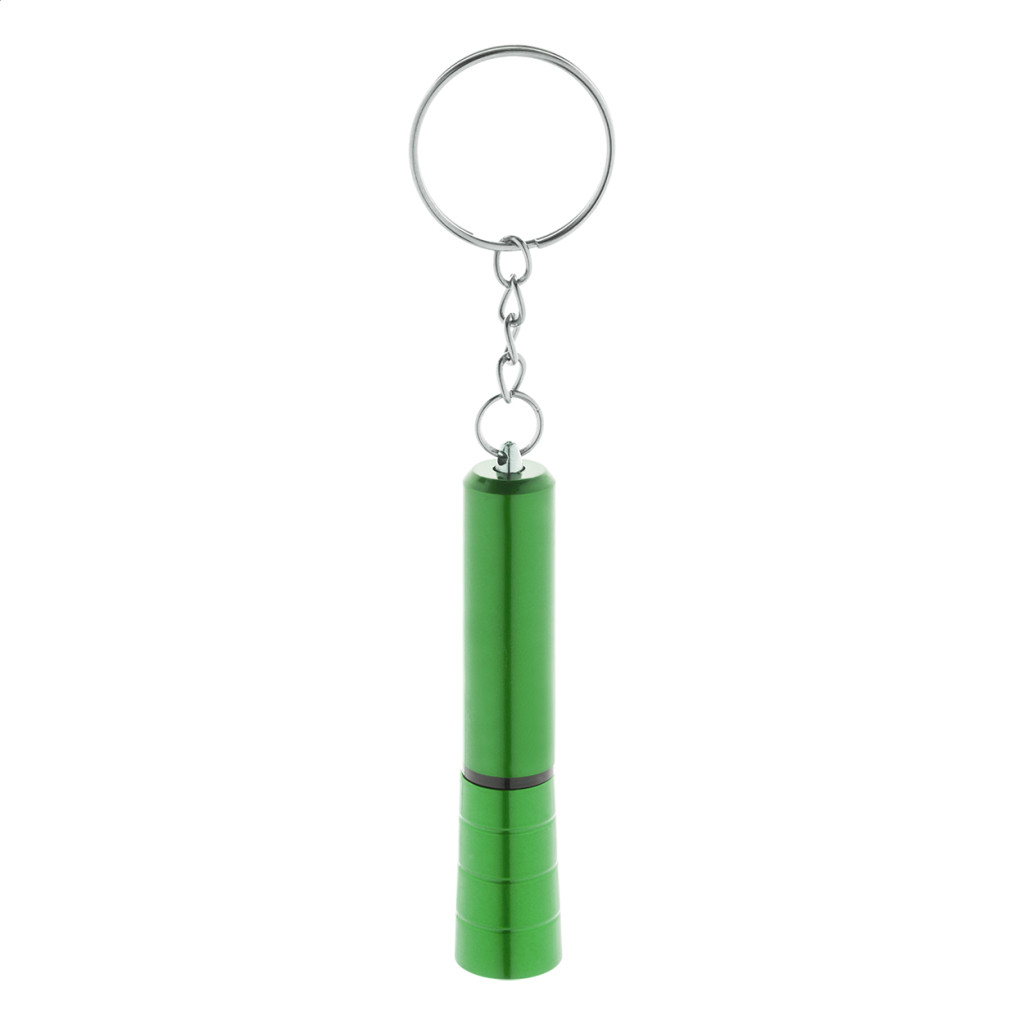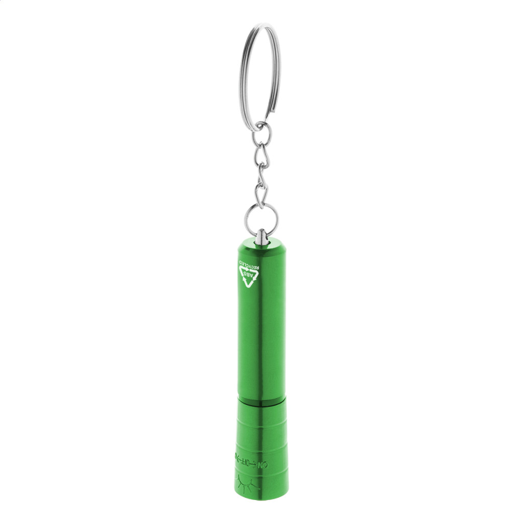 Újrahasznosított ABS műanyag, mini zseblámpa 1 LED-del, fémes felülettel és fém kulcstartóval. Gombelemmel szállítjuk. Jobb oldal