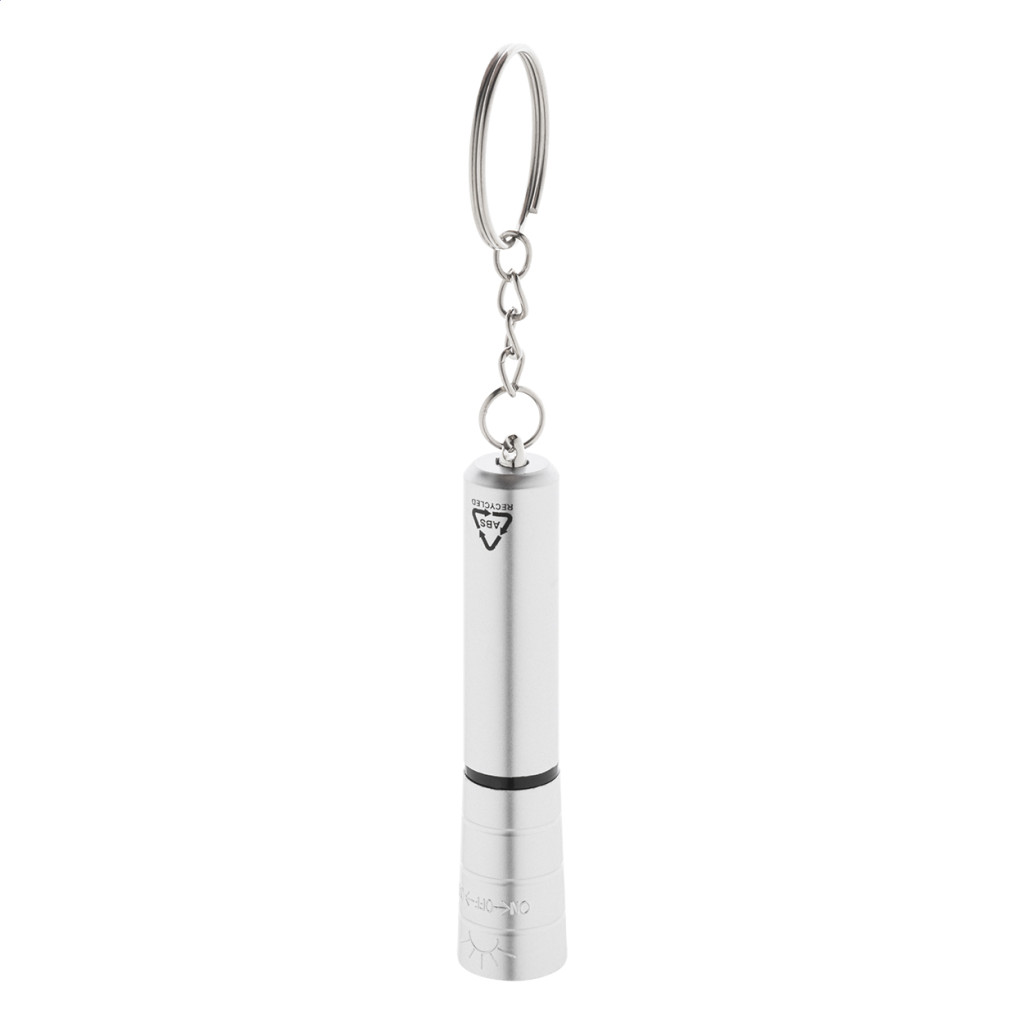 Újrahasznosított ABS műanyag, mini zseblámpa 1 LED-del, fémes felülettel és fém kulcstartóval. Gombelemmel szállítjuk. Jobb oldal