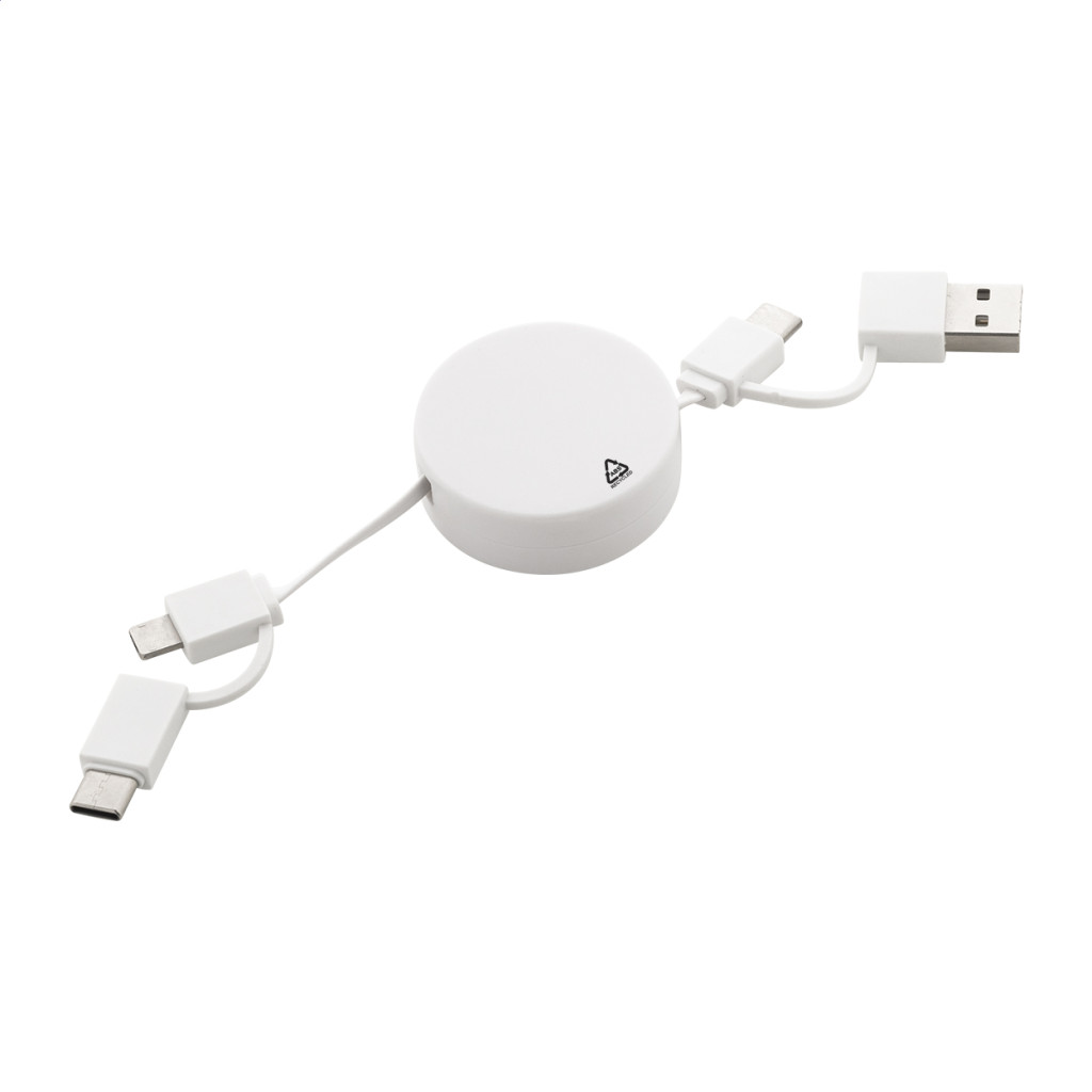 Teleszkópos USB töltőkábel újrahasznosított ABS-ből, micro USB, USB-C és lightning csatlakozókkal. USB és USB-C bemenettel. Teteje