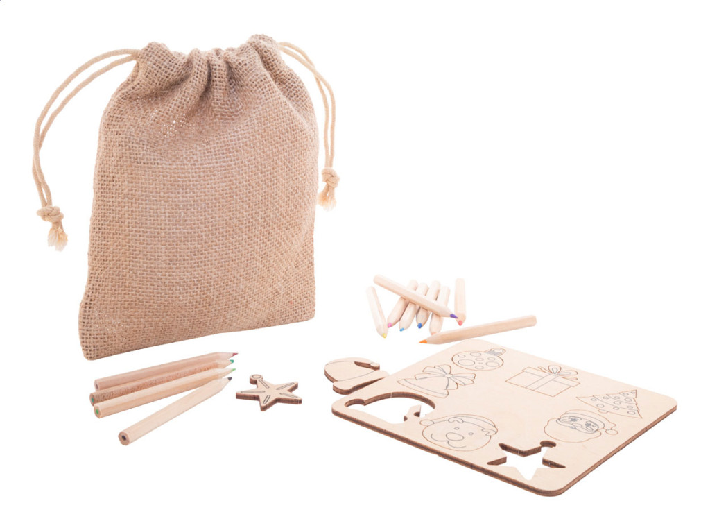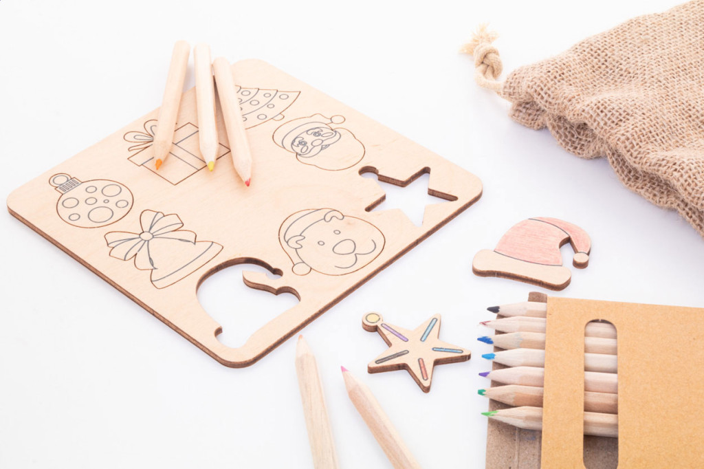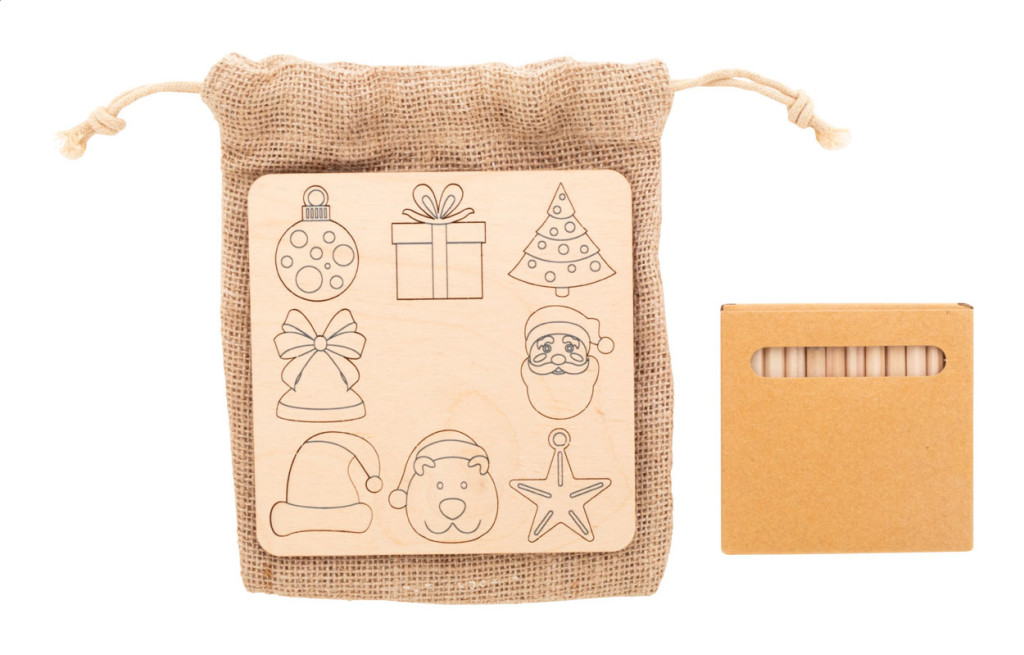 Karácsonyi színezős formakereső játék rétegelt nyírfából, juta tasakban. Tematikus kivágott figurákat (8 db) és fa színes ceruzákat (12 db) tartamaz, papírdobozban. Fa rész - eleje