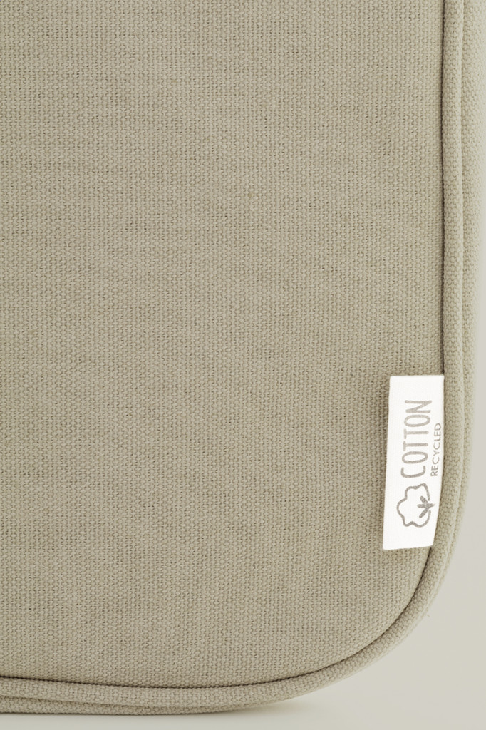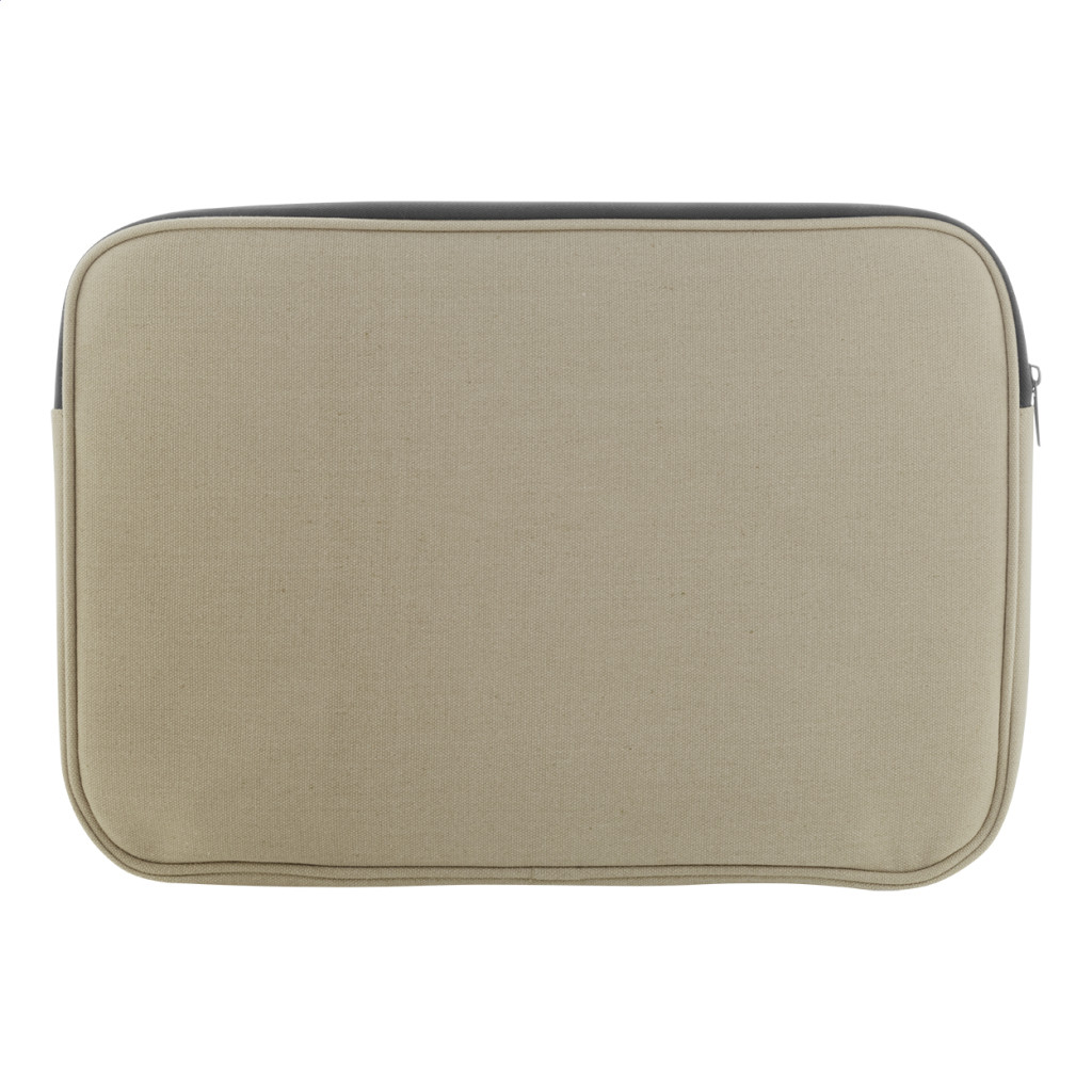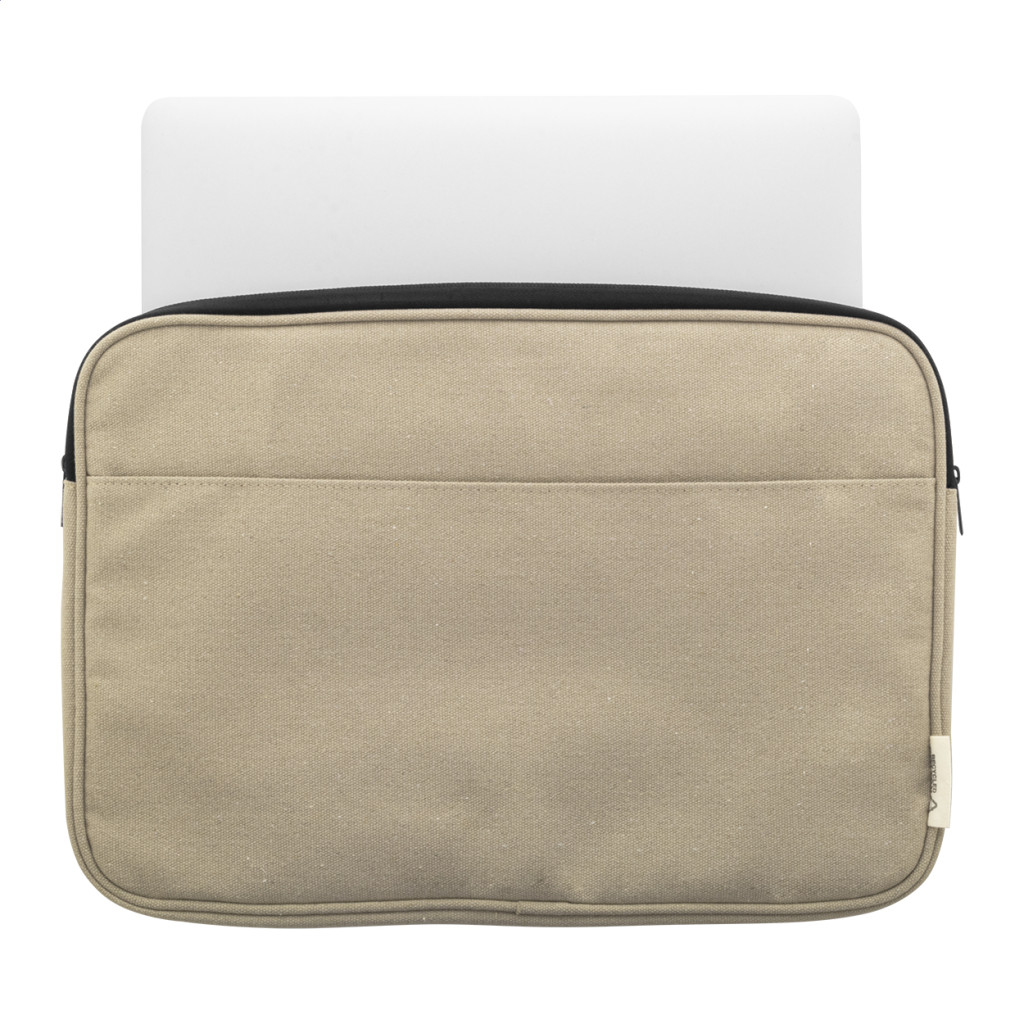 Teljesen párnázott újrahasznosított vászon laptoptáska cipzáras rekesszel és elülső zsebbel. Legfeljebb 15"-os laptopokhoz használható. 70% újrahasznosított pamut és 30% RPET poliészter. Megkülönböztető újrahasznosított pamut címkével. Zseb