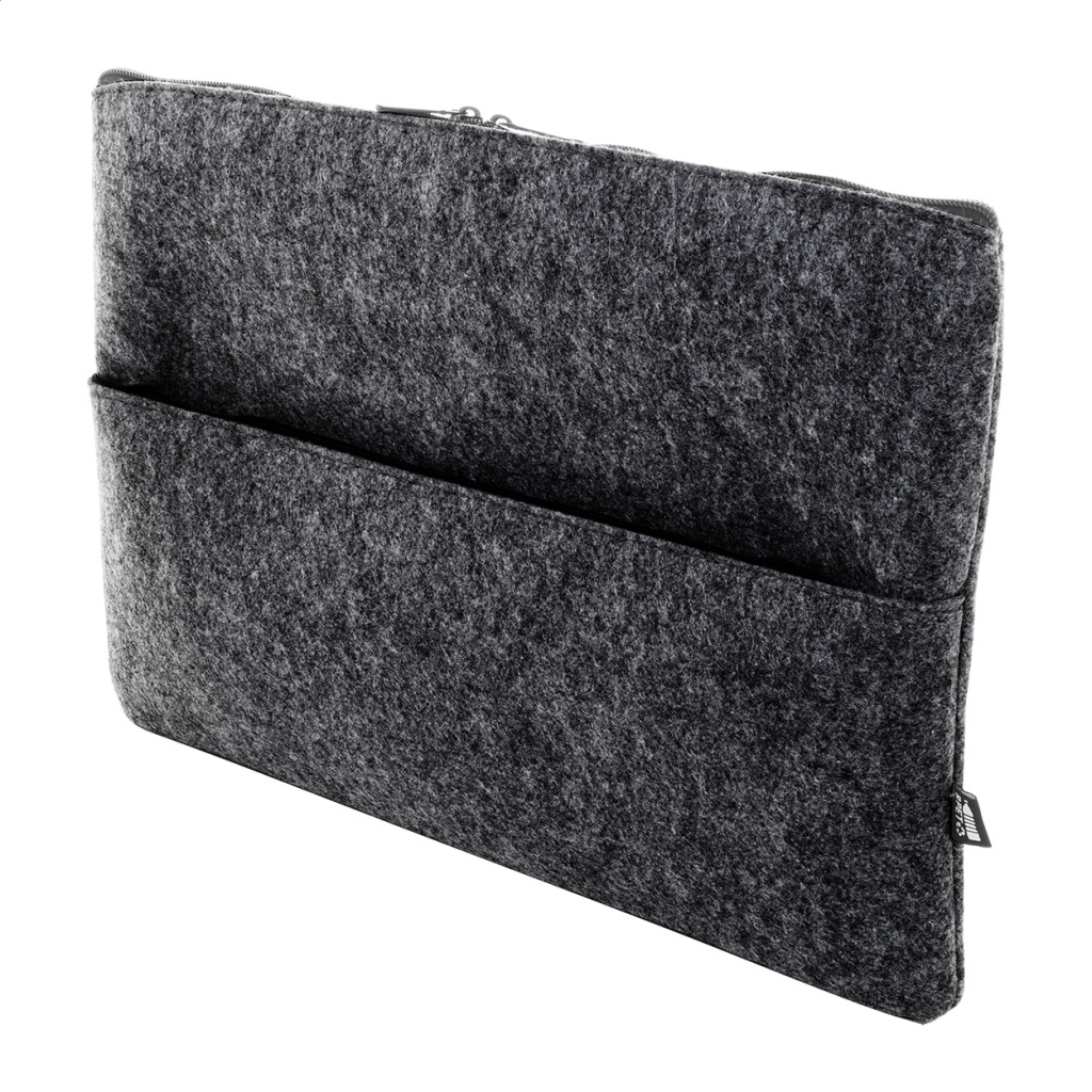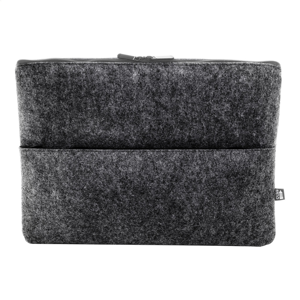 RPET filc laptoptáska cipzáras rekesszel és elülső zsebbel. Legfeljebb 15"-os laptopokhoz használható, megkülönböztető RPET címkével. Eleje - cipzár fölött