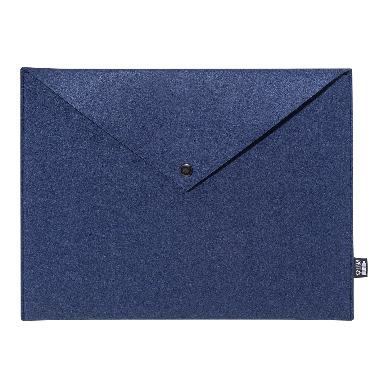 RPET filcből készült irattáska vagy laptoptáska gombos záródással. Legfeljebb 13"-os laptopokhoz alkalmas. Megkülönböztető RPET címkével. Eleje - teteje