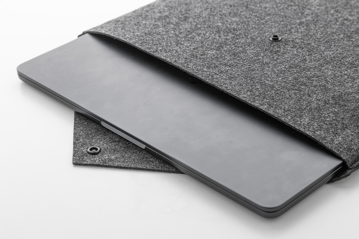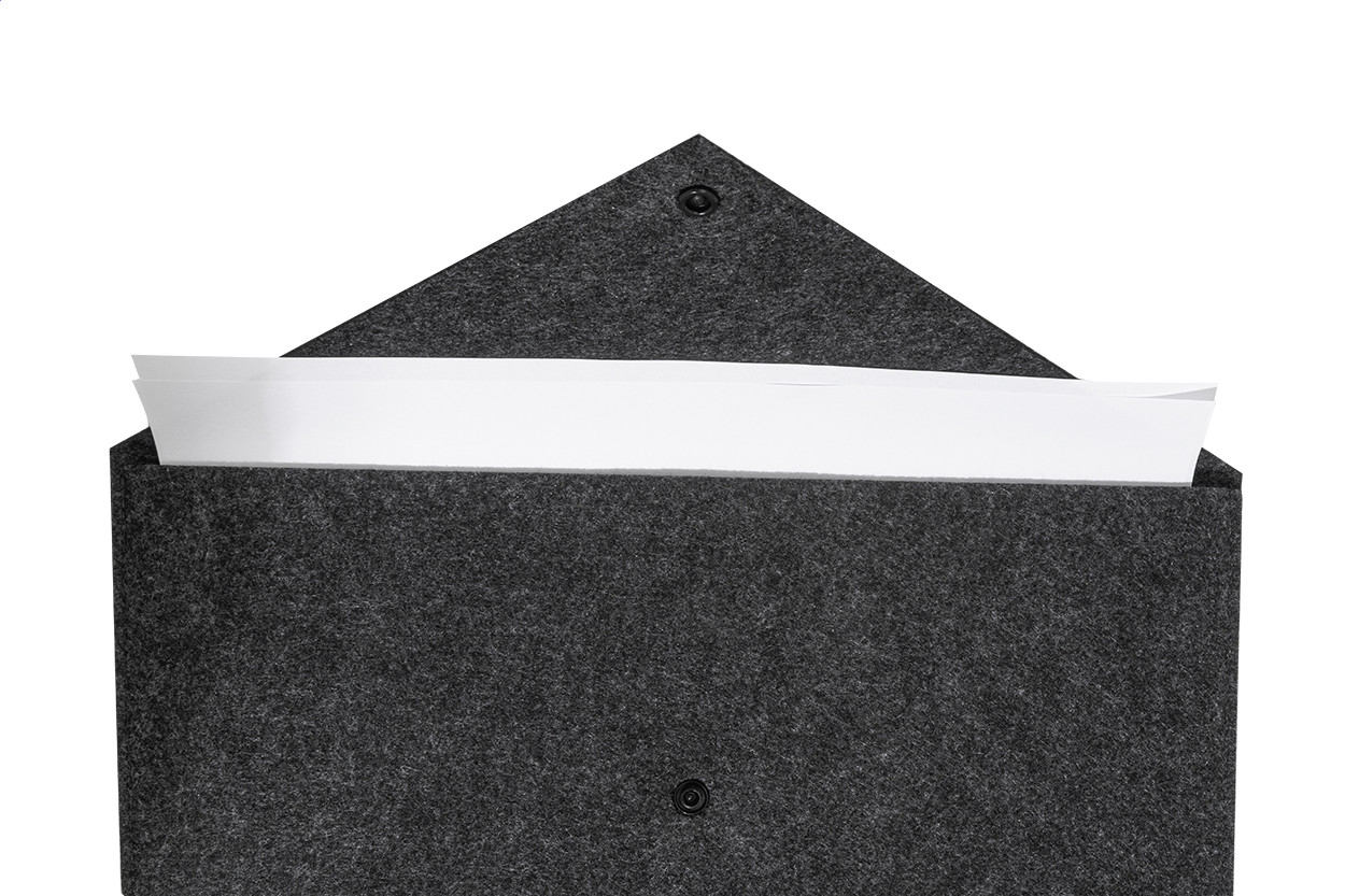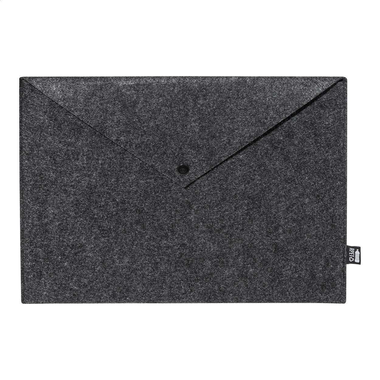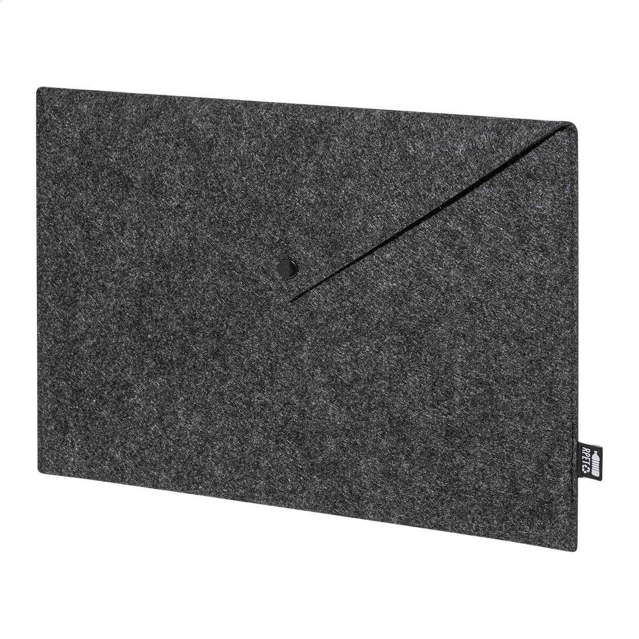 RPET filcből készült irattáska vagy laptoptáska gombos záródással. Legfeljebb 13"-os laptopokhoz alkalmas. Megkülönböztető RPET címkével. Eleje - teteje