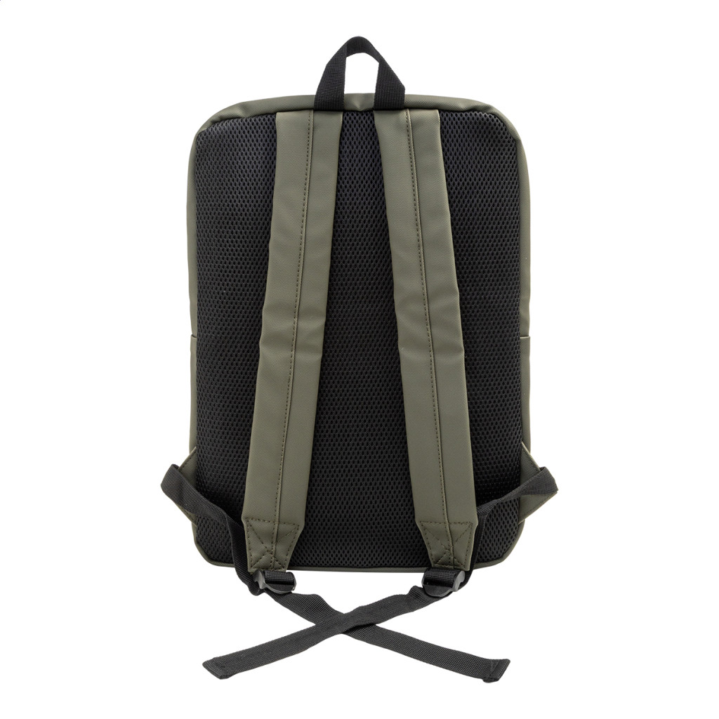 Vízálló RPET vékony laptop hátizsák cipzáras laptoprekesszel (15") és cipzáras elülső zsebbel. Párnázott hát- és vállpántokkal. Műbőr bevonatú 600D RPET poliészter, megkülönböztető RPET címkével. Zseb fölött