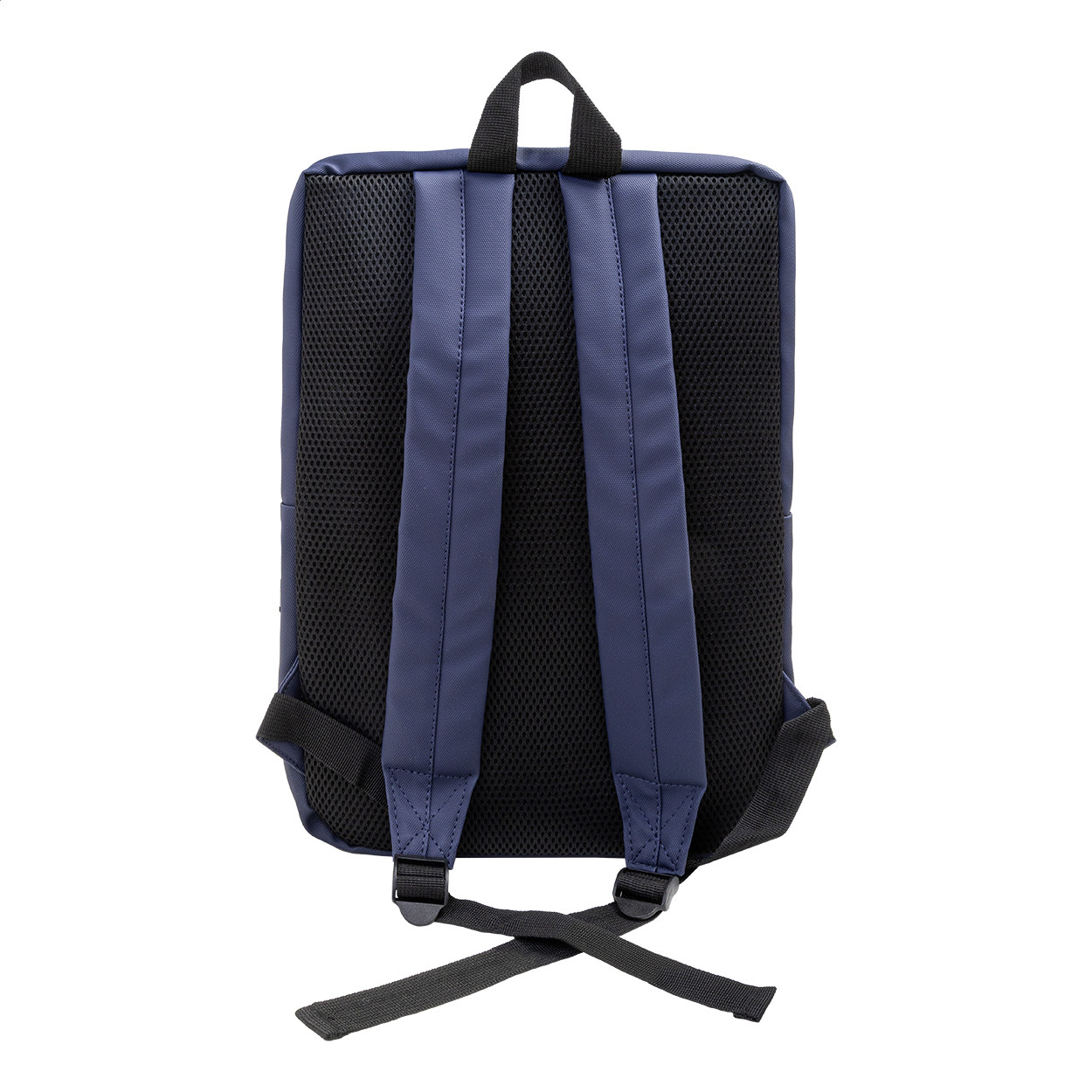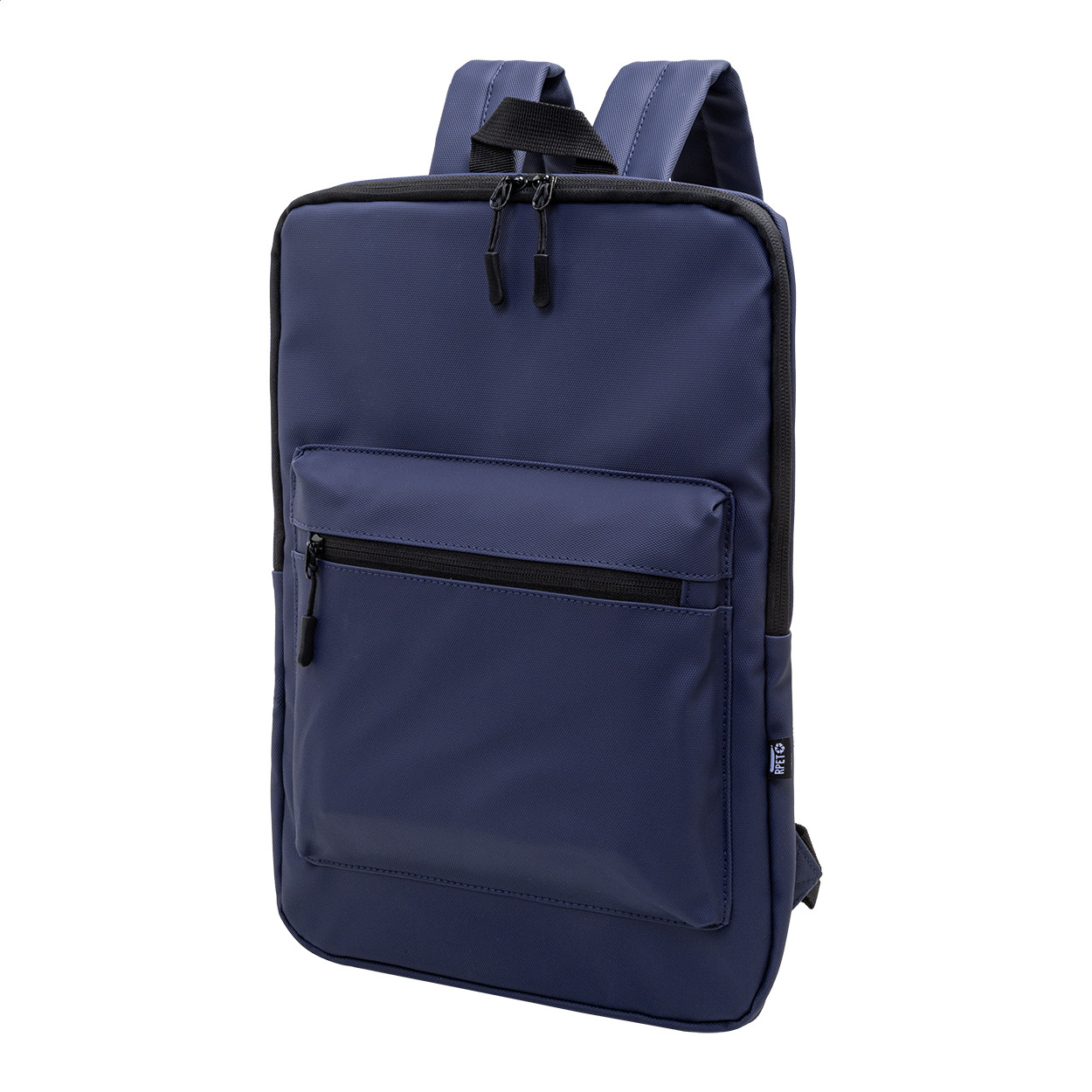 Vízálló RPET vékony laptop hátizsák cipzáras laptoprekesszel (15") és cipzáras elülső zsebbel. Párnázott hát- és vállpántokkal. Műbőr bevonatú 600D RPET poliészter, megkülönböztető RPET címkével. Zseb fölött