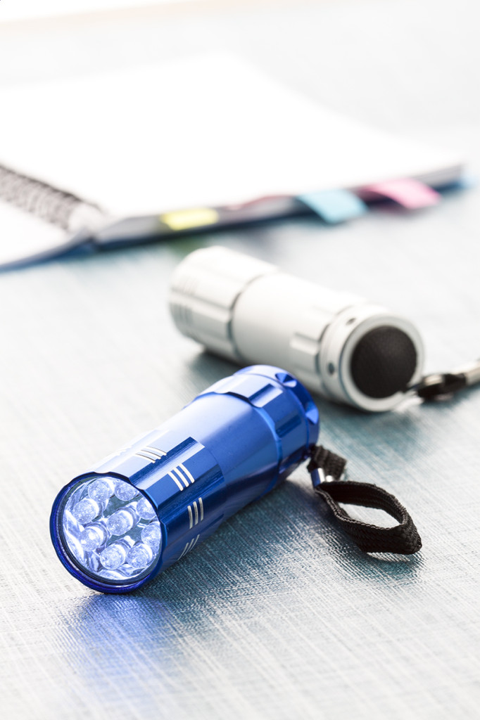 Fehér fénnyel világító, 9 LED-es fém zseblámpa, végén akasztóval. 3 db AAA elemmel szállítjuk. Jobb oldal