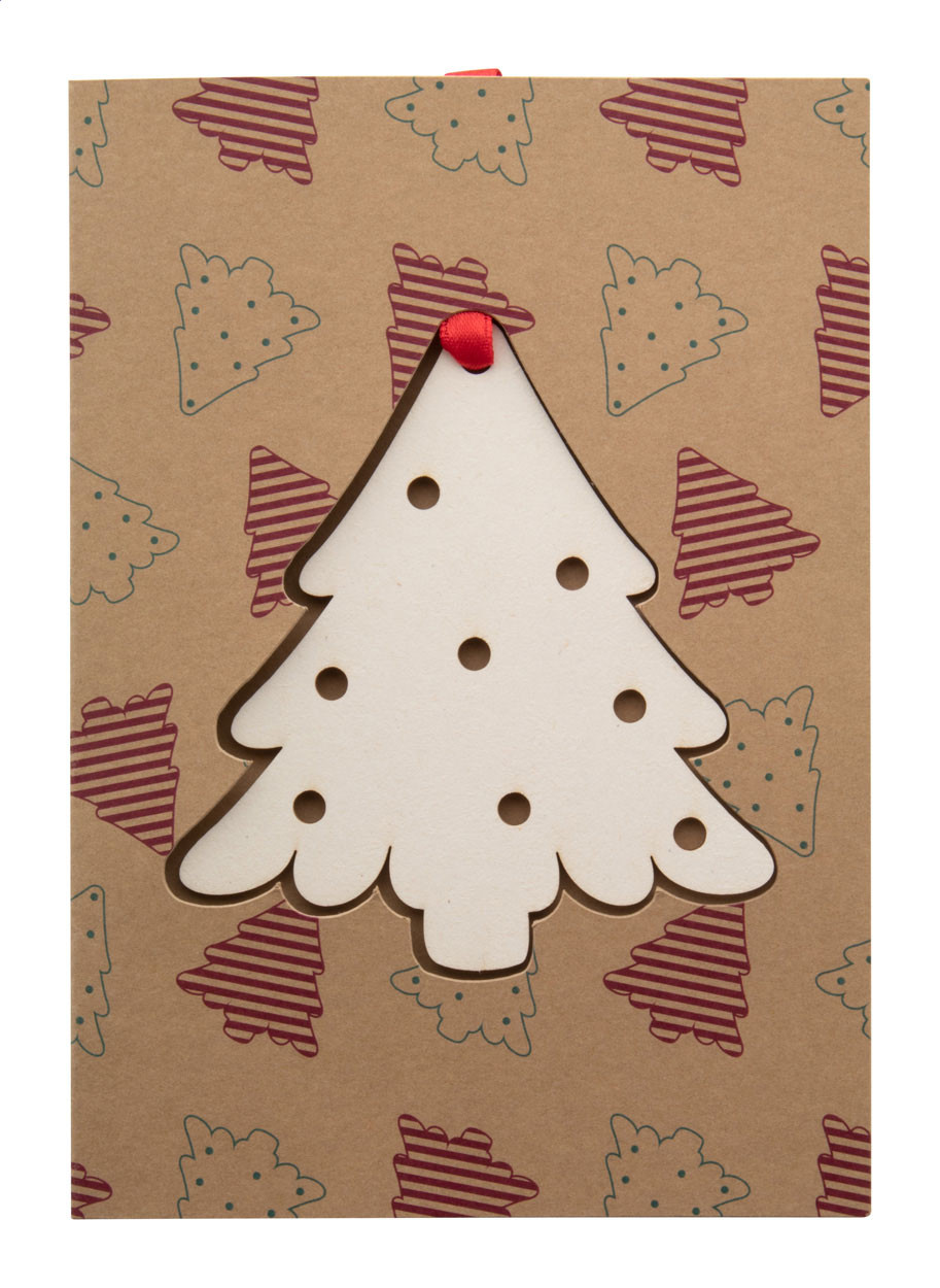 Egyedi grafikával, kraft papírból készült, mindkét oldalán emblémázható karácsonyi üdvözlőlap cellulóz lemezből készült karácsonyfadísszel piros szalagon. C6 borítékkal szállítjuk. Minimum rendelési mennyiség: 100 db. Külső borító