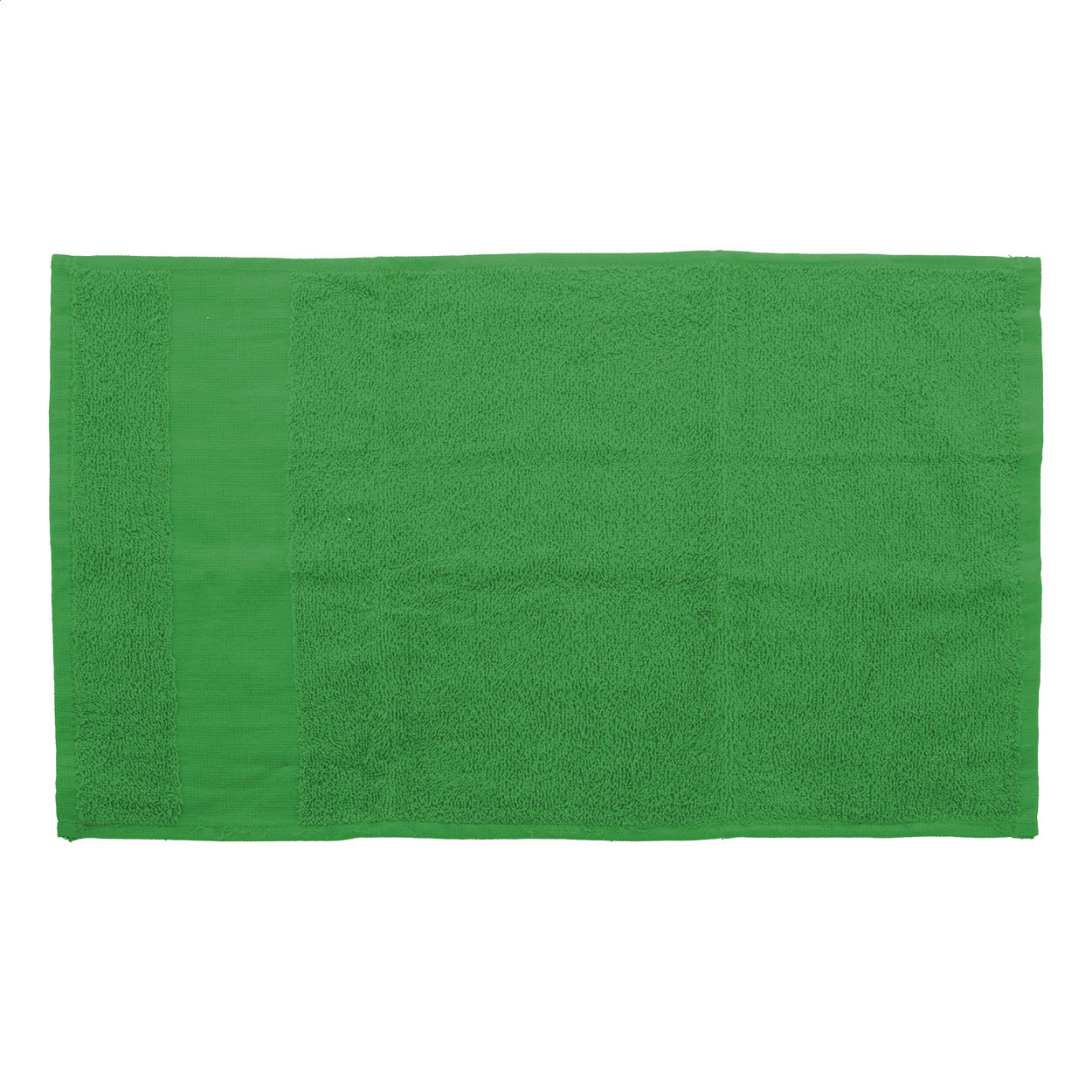 Pamut frottír vendégtörülköző akasztóval és nyomtatható szegéllyel. 100% pamut, 360 g/m². Eleje