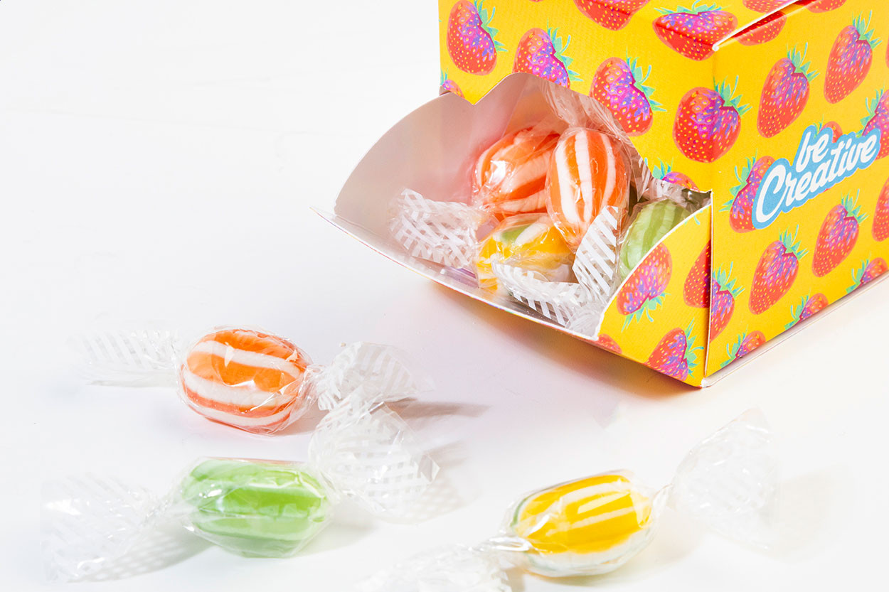 Egyedi gyártású, kocka alakú cukorkaadagoló doboz, teljes felületén full-colour nyomtatással. 40 gramm egyenként csomagolt vegyes gyümölcscukorral töltve. Minimális rendelési mennyiség: 100 db. |