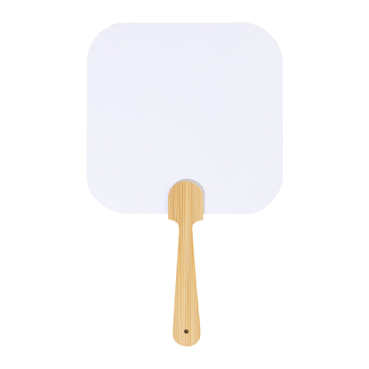 Egyedi gyártású kézi legyező bambusz nyéllel és laminált papírral. Digitális nyomtatással mindkét oldalán. Minimális rendelési mennyiség: 100 db. Eleje