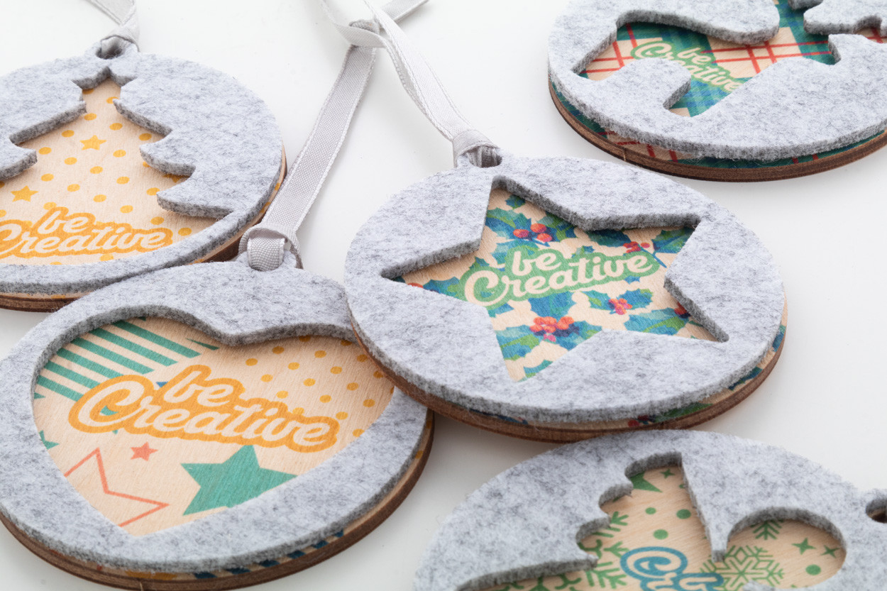 Egyedi gyártású, kétrétegű, RPET filcből és rétegelt nyírfából készült karácsonyfadísz ezüst szalaggal, a felső rétegén kivágott karácsonyi mintával. Az ár tartalmazza az UV LED nyomtatást az alsó rétegen. Minimális rendelési mennyiség: 100 db. |
