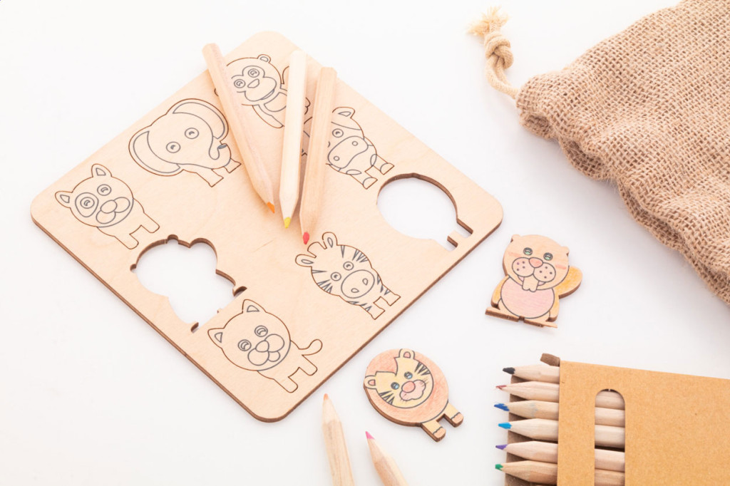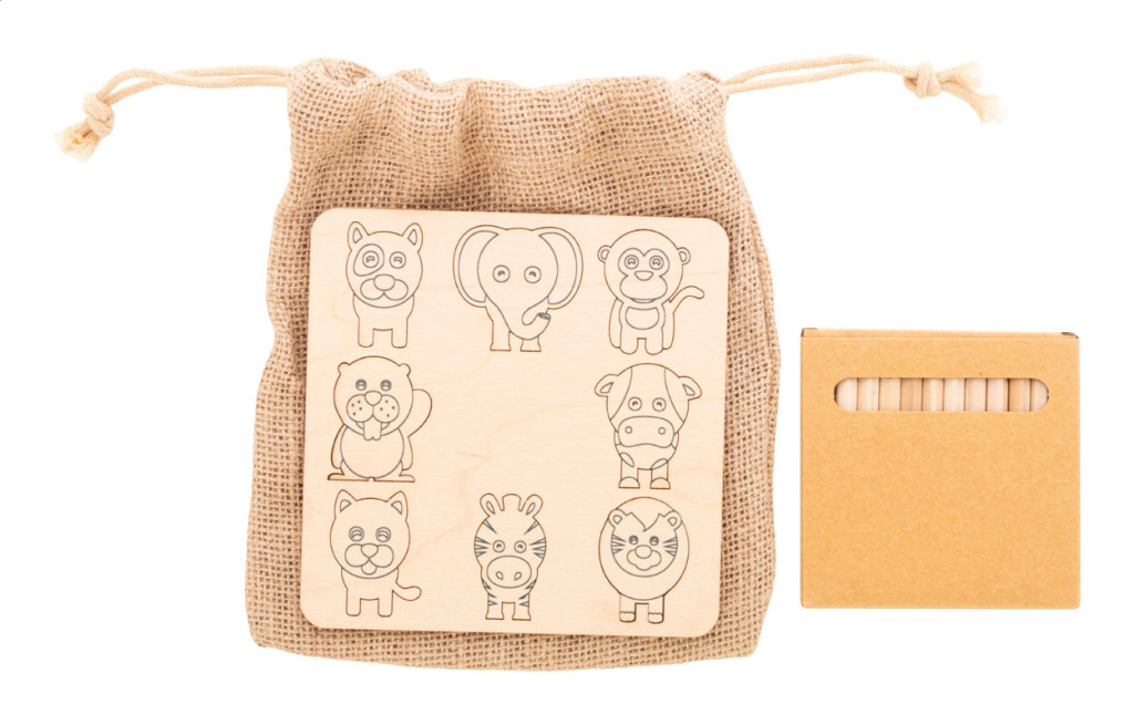 Színezős formakereső játék rétegelt nyírfából, juta tasakban. Tematikus kivágott figurákat (8 db) és fa színes ceruzákat (12 db) tartamaz, papírdobozban. Fa rész - eleje