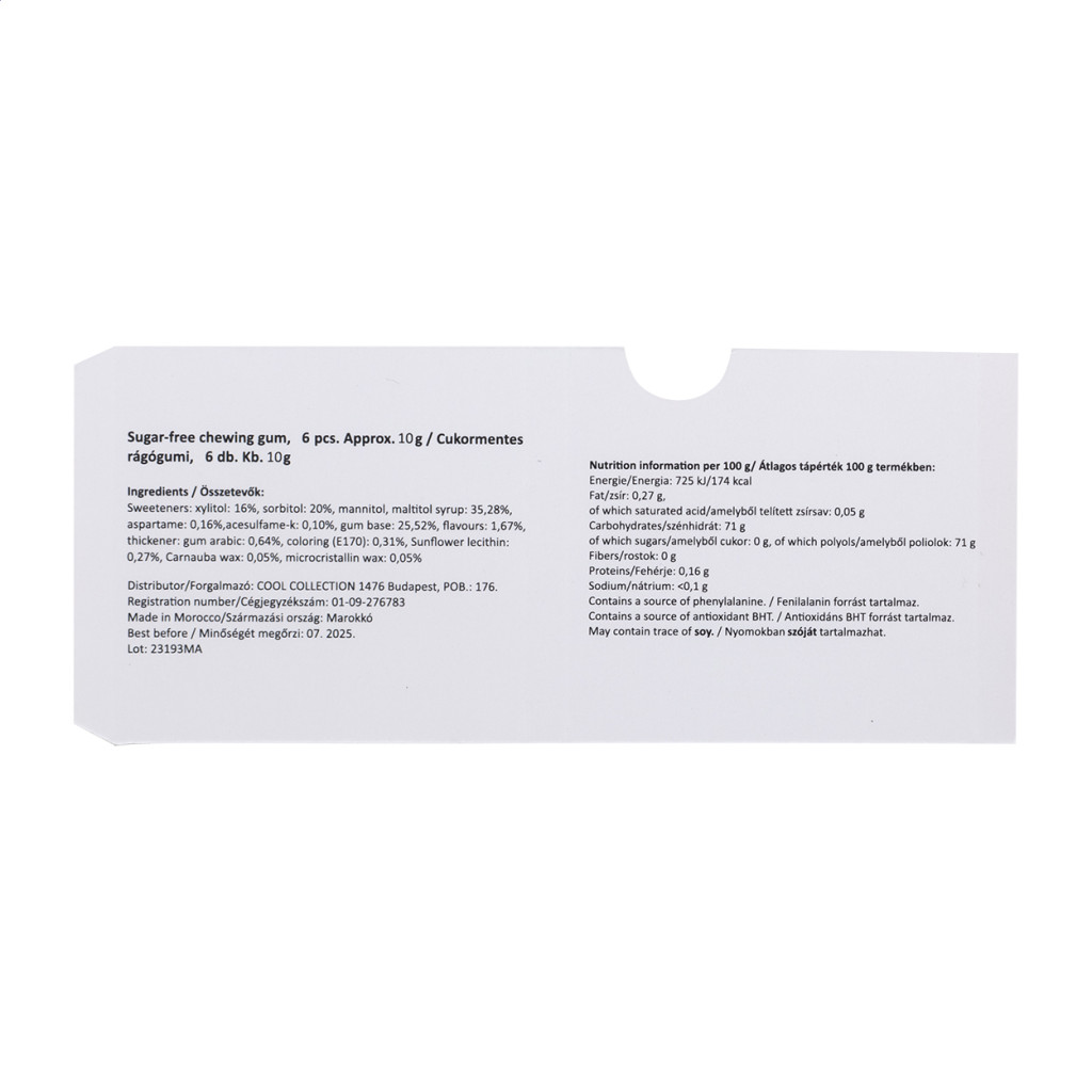 6 db cukormentes rágógumi buborékfóliában, egyedi gyártású, full colour nyomtatott papírgyűrűvel. Minimális rendelési mennyiség: 100 db.