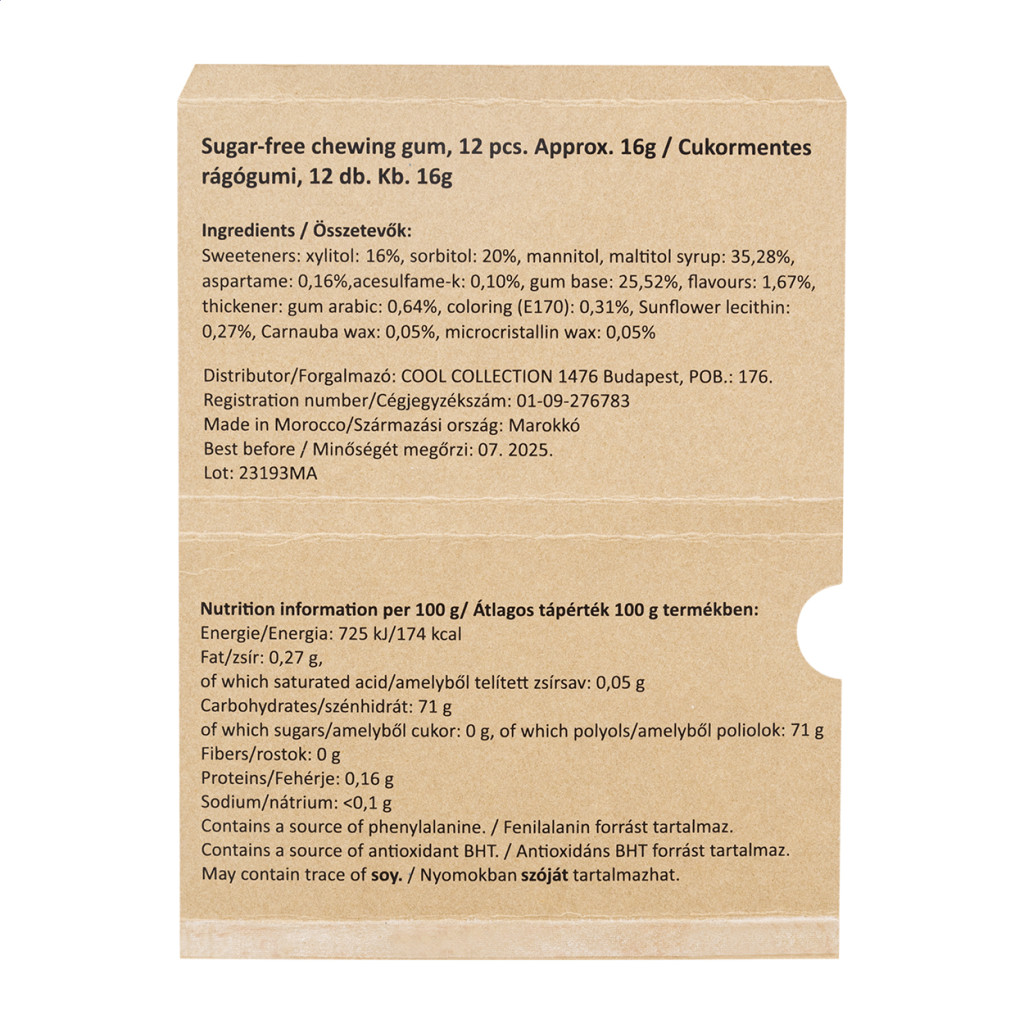Rágógumi, egyediesíthető kraft papír tartóban.