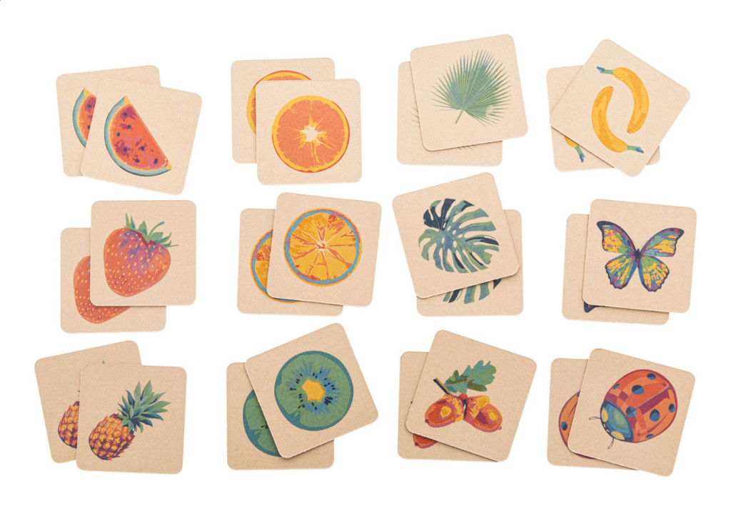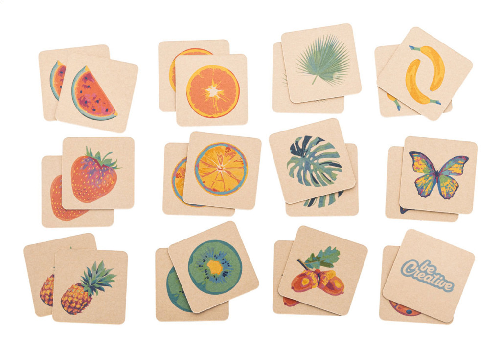 Egyedi gyártású, kraft papír memóriajáték egyedi kraft papír dobozban. 24 lapkával (55x55 mm). Az ár tartalmaz 12 különböző full colour nyomatot a lapka elülső oldalán, 1 full colour nyomatot az összes csempe hátoldalán és egy full colour nyomtatású dobozt.Minimális rendelési mennyiség: 250 db. Eleje